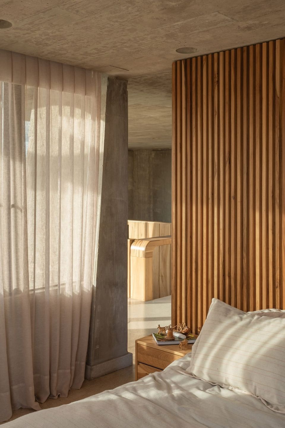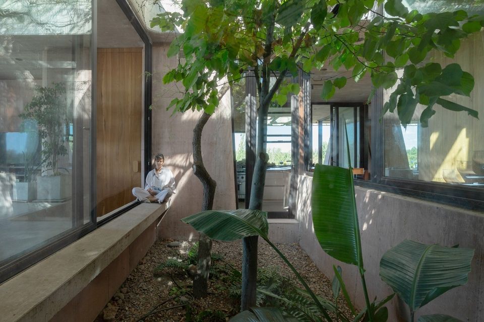 Основним матеріалом став неоштукатурений бетон — у резонансі з місцевими будівельними традиціями та кольором землі на ділянці. «Ця увага до матеріальності візуально й символічно закорінює будинок у місці», — зазначають архітектори. Замовники прагнули жити разом із землею, зберігаючи краєвиди, приватність і водночас прямий зв’язок із природою.