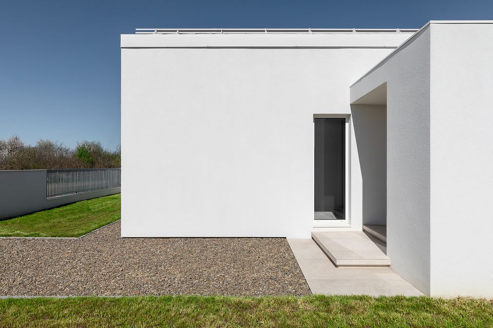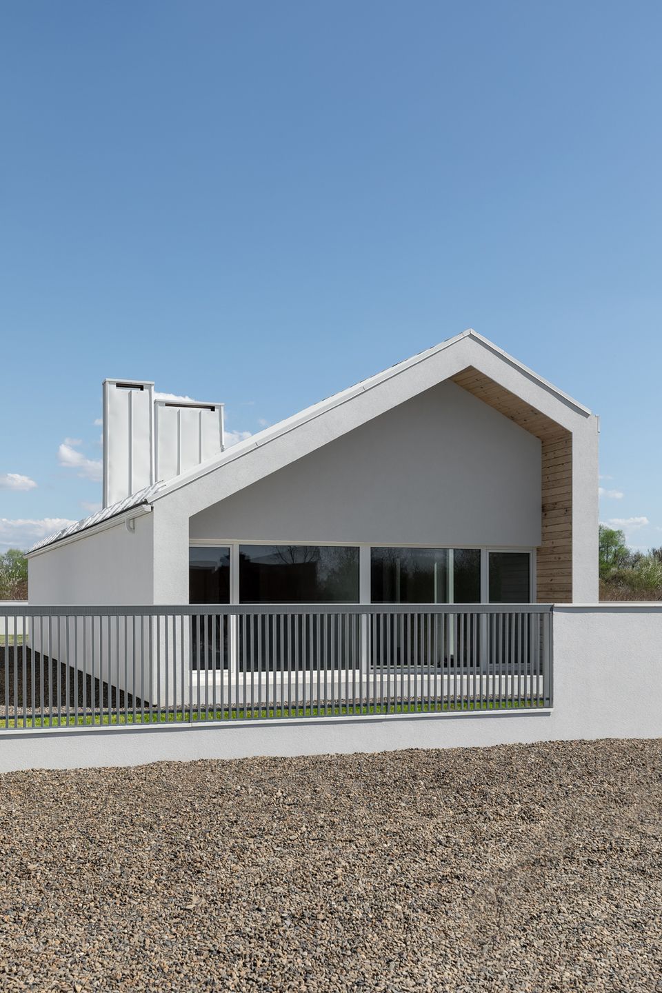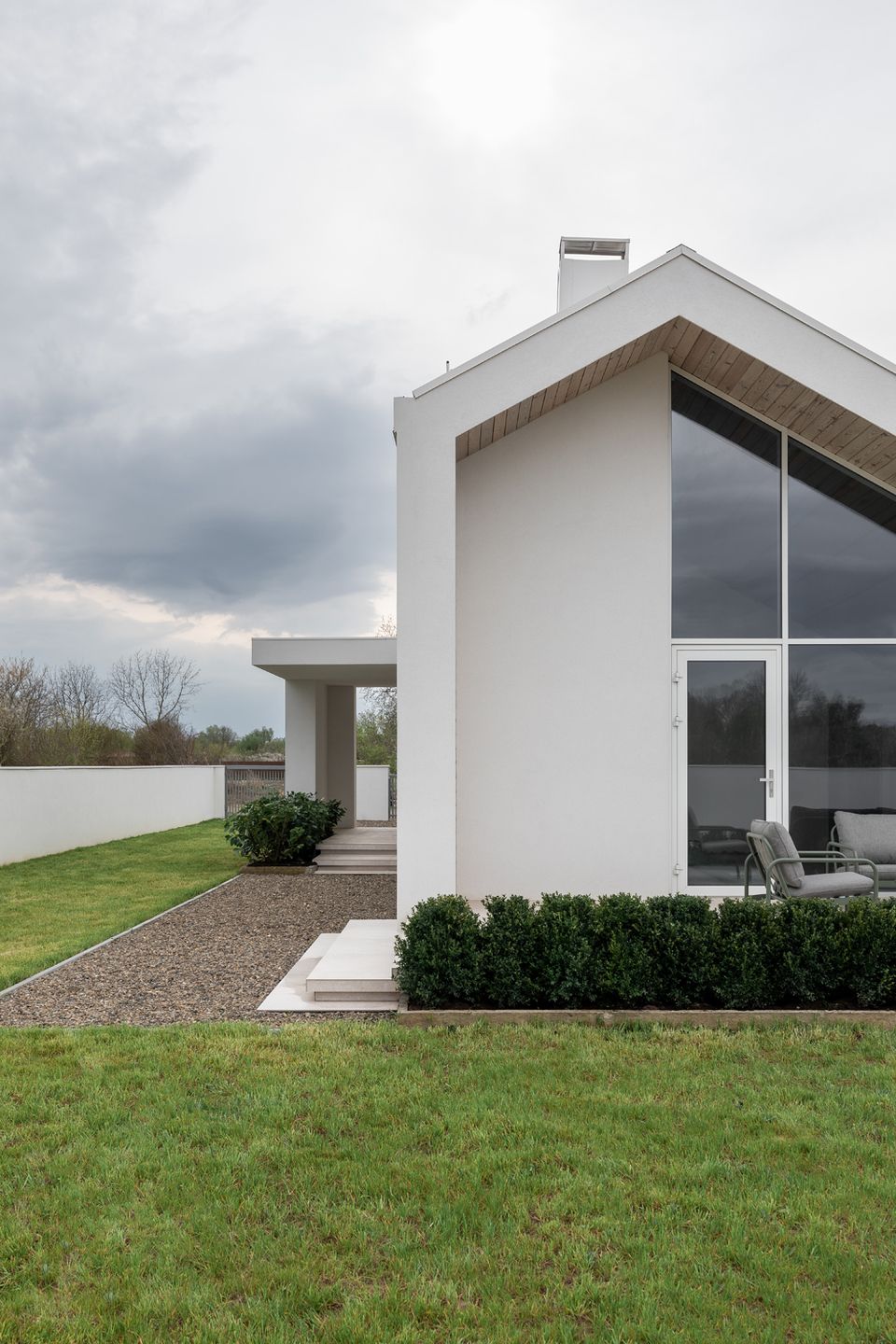 У проєкті відсутні випадкові рішення — матеріальна палітра підпорядкована ідеї довговічності та простоти експлуатації. Білий фасад формує стриманий, майже абстрактний образ, тоді як дерев’яні акценти додають тепла й тактильності. Це не декоративний елемент, а спосіб збалансувати строгість архітектури з людським масштабом. Матеріали працюють на час — будинок не втрачає актуальності, а навпаки, стає спокійнішим і природнішим у сприйнятті.