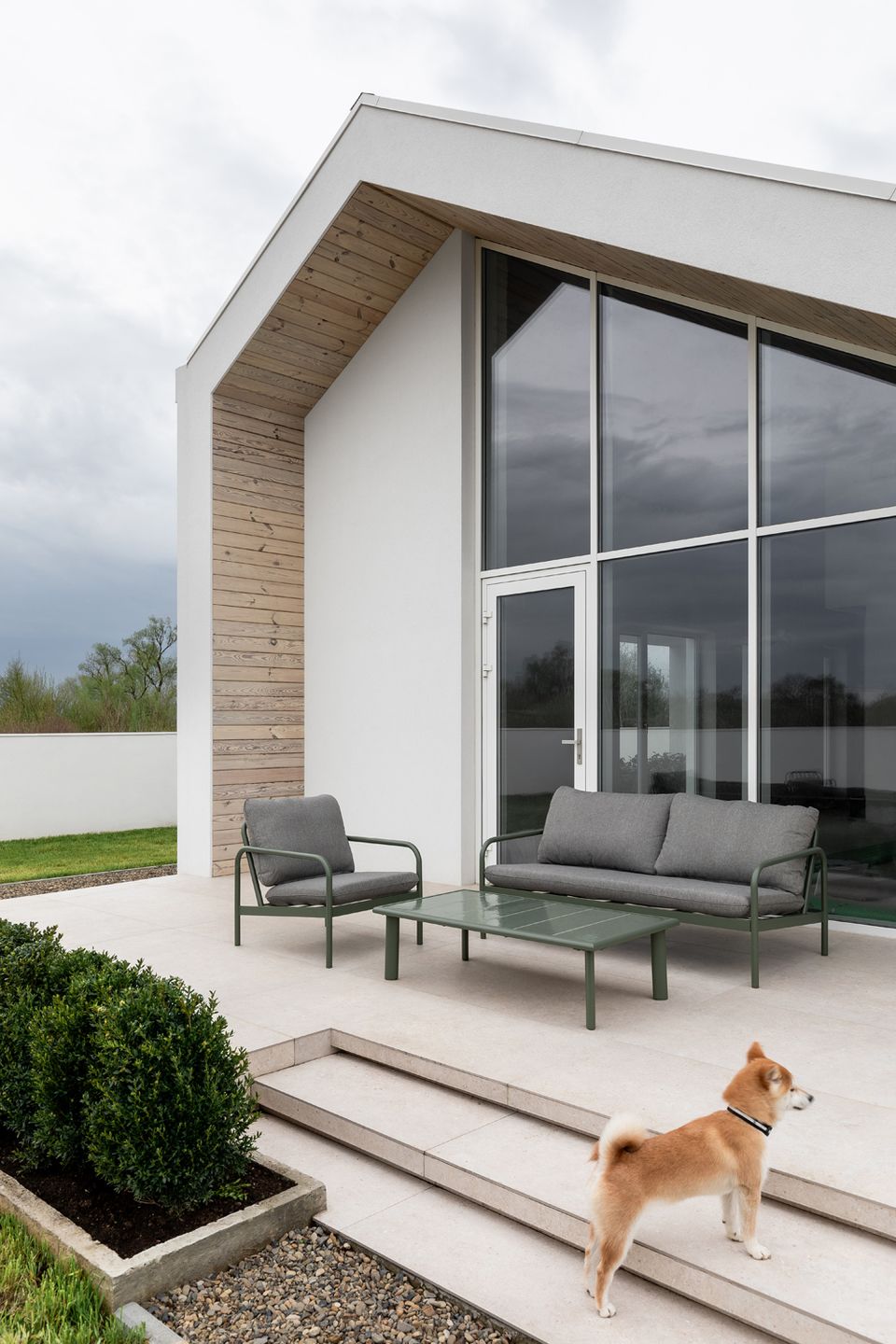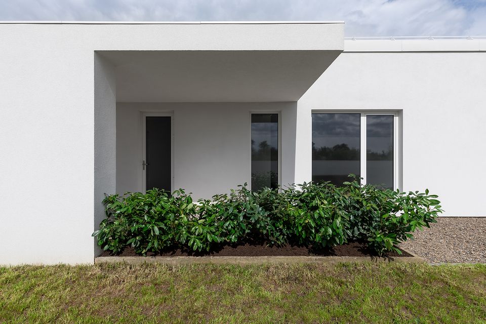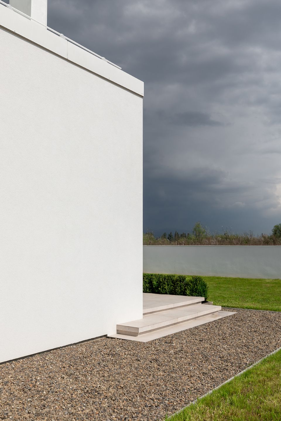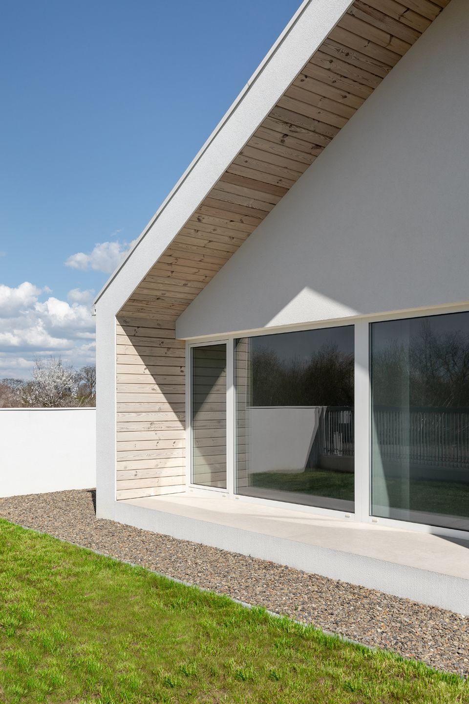 У проєкті відсутні випадкові рішення — матеріальна палітра підпорядкована ідеї довговічності та простоти експлуатації. Білий фасад формує стриманий, майже абстрактний образ, тоді як дерев’яні акценти додають тепла й тактильності. Це не декоративний елемент, а спосіб збалансувати строгість архітектури з людським масштабом. Матеріали працюють на час — будинок не втрачає актуальності, а навпаки, стає спокійнішим і природнішим у сприйнятті.