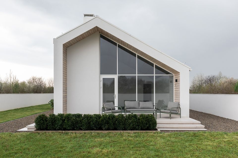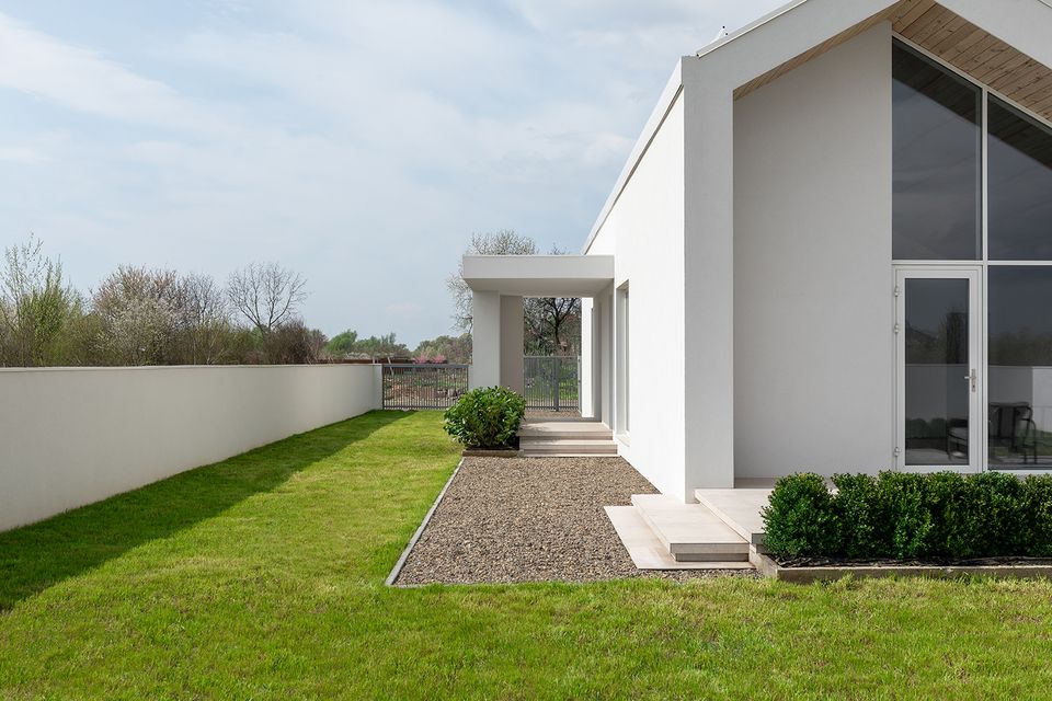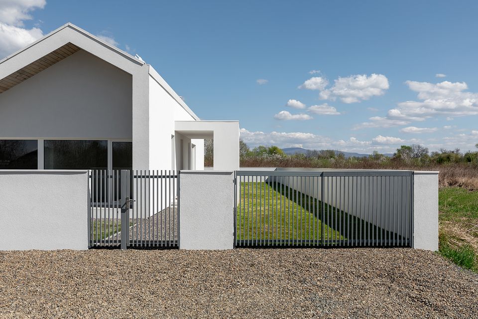 Архітектура DOMIK HOUSE базується на лаконічній геометрії та чистоті пропорцій. Білий об’єм, позбавлений зайвих жестів, працює через світло: воно моделює форму, підкреслює глибину і змінює сприйняття протягом дня. Свідомий вибір одноповерхової структури дозволив зберегти горизонтальність простору та водночас інтегрувати друге світло у вітальні. Відкрита вертикаль додає об’єму без ускладнення конструкції — архітектура залишається простою, але не спрощеною.