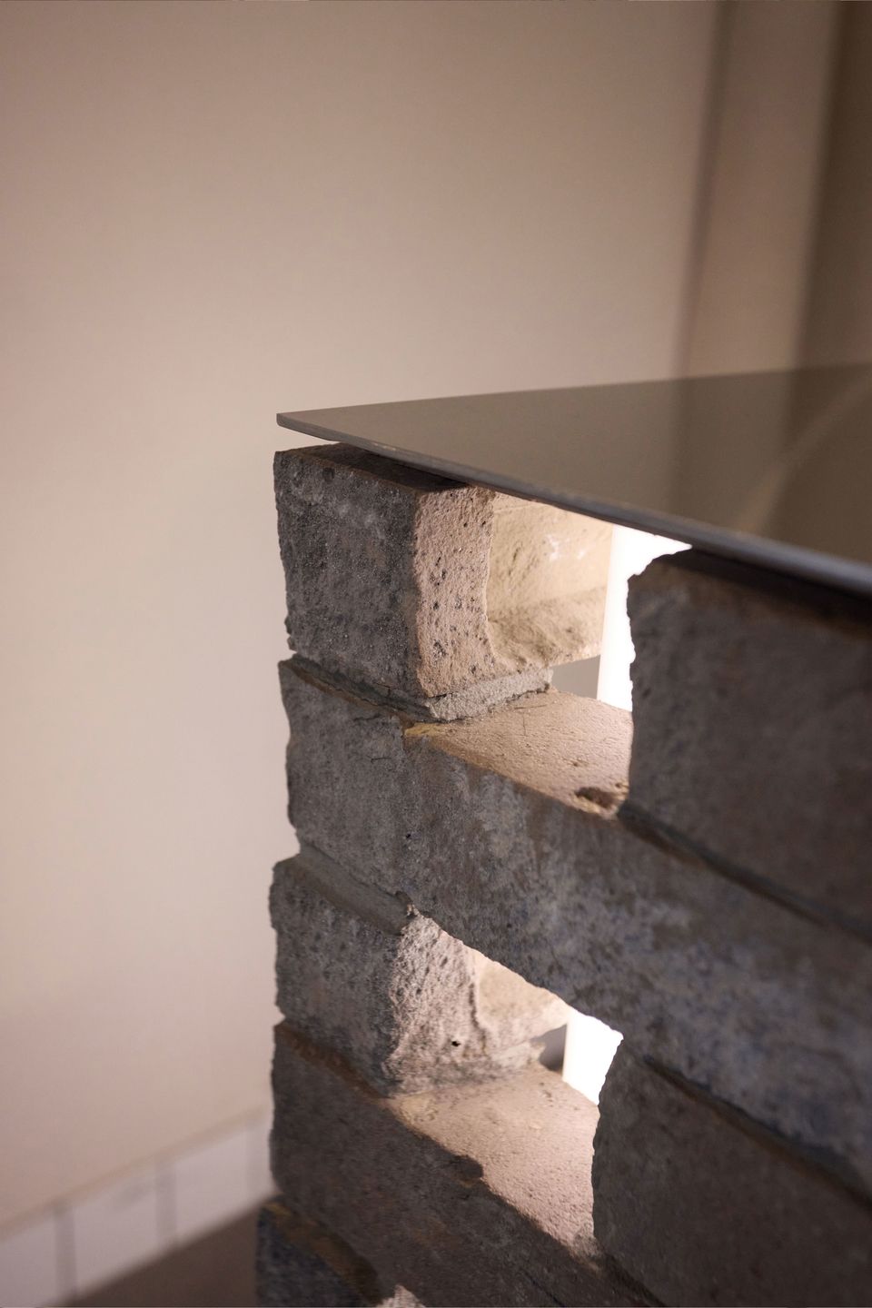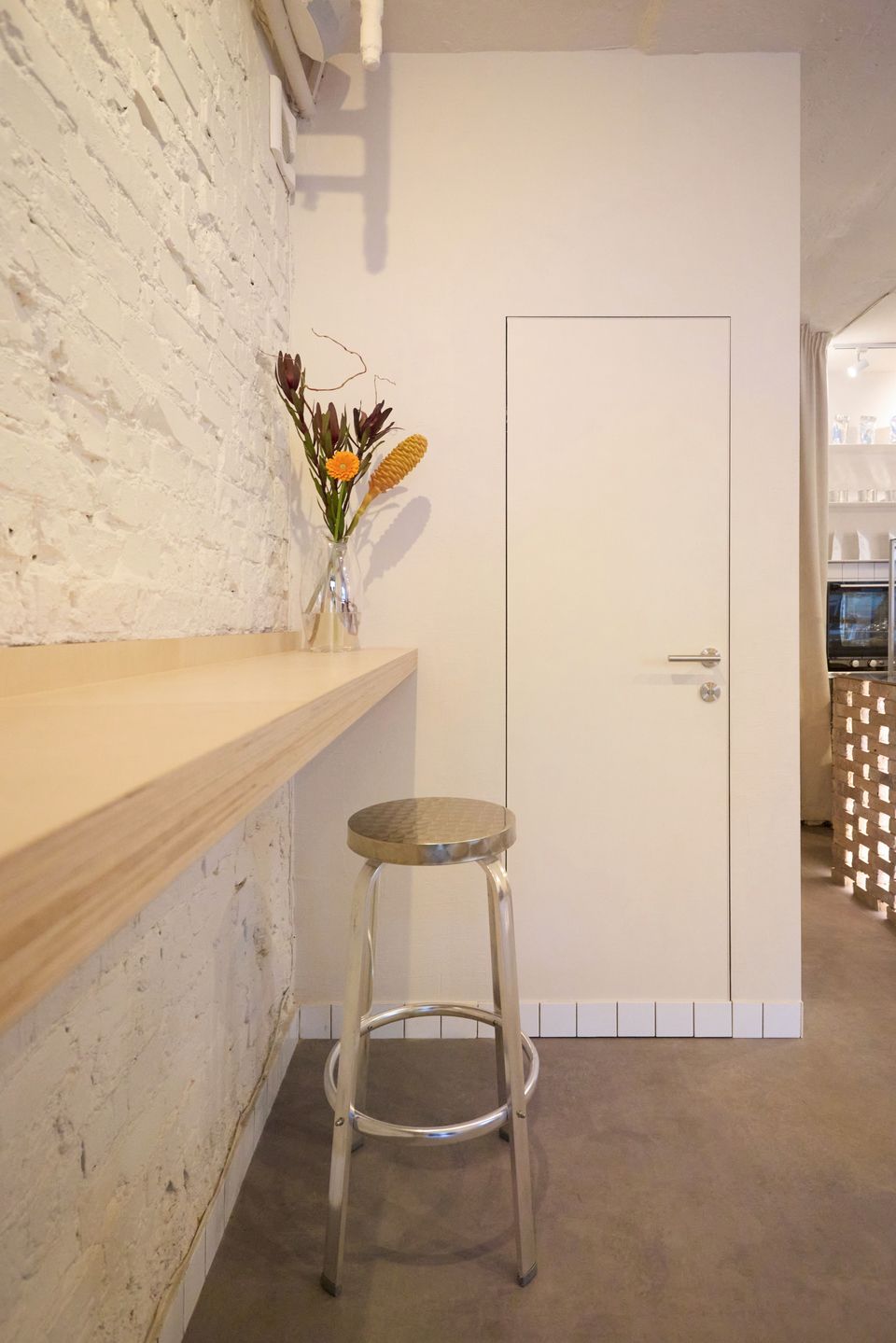 Усі інші елементи працюють як фон, не конкуруючи з головним акцентом. Цегла вводить легкий історичний контекст, особливо у поєднанні зі збереженими стіновими блоками 1970-х років, тоді як поліровані металеві деталі додають сучасного контрасту та завершують загальну атмосферу.
