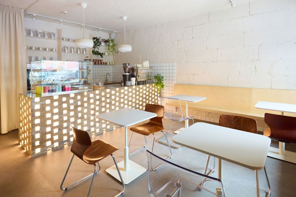 Простір розрахований на десять посадкових місць: вісім за столами та два — за високою барною стійкою біля входу. У теплу пору року додаються три столики на терасі, що збільшує загальну кількість місць до шістнадцяти.