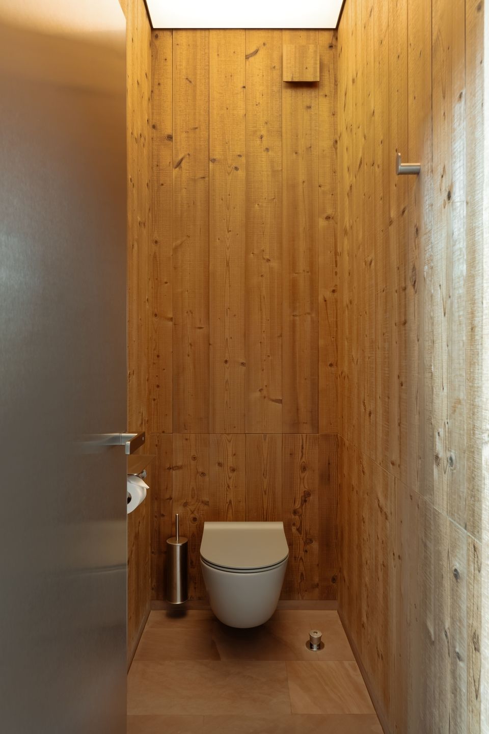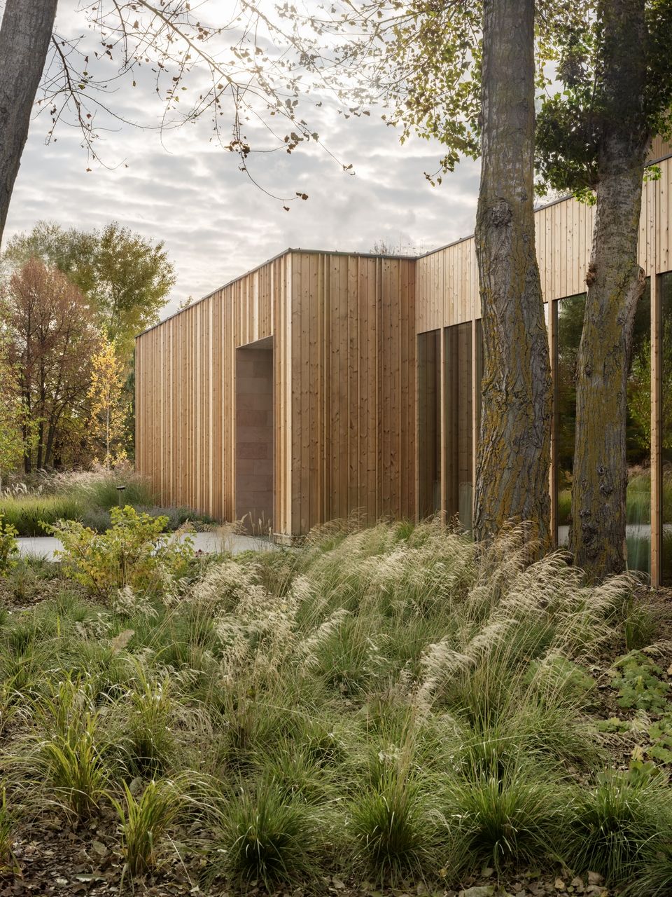 Додатковий діалог між внутрішнім і зовнішнім середовищем створюють локальні сосни у масивних кадках, розміщені безпосередньо в інтер’єрі. Для забезпечення природного освітлення рослин у стелі передбачили круглі світлові отвори. Вони не лише виконують функціональну роль, а й додають простору неочікуваної пластичності, розбавляючи мінімалістичну геометрію м’якими, майже космічними формами.