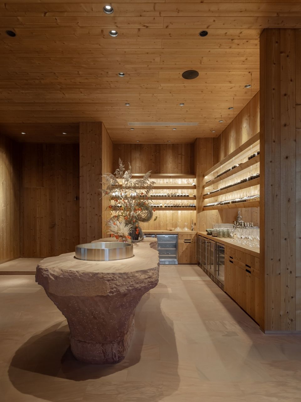 Особливою домінантою простору стала масштабна винна конструкція, витесана з цільного масиву пісковика у вхідному холі. Важка, фактурна брила не маскує свою матеріальну природу, а навпаки — запрошує до тактильного контакту. На тлі поширеної практики використання імітаційних матеріалів у громадських інтер’єрах, цей елемент підкреслює послідовність концепції та принципову відмову від декоративності заради автентичності.