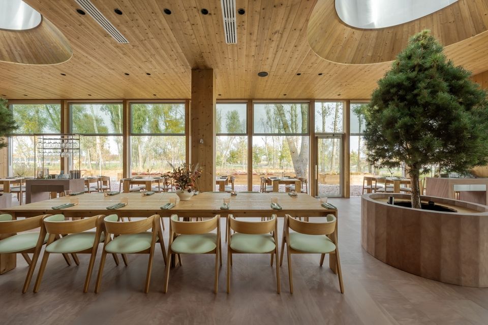 Ресторан Farm Table, створений студією YOD Group у межах ландшафтного ресторанно-готельного комплексу Seven Lakes поблизу Києва, ніби зростає з ландшафту. Тут немає різкої межі між залом і садом, між інтер’єром і природою, між процесом і результатом. Простір запрошує зупинитися, видихнути й відчути ритм навколишнього середовища.