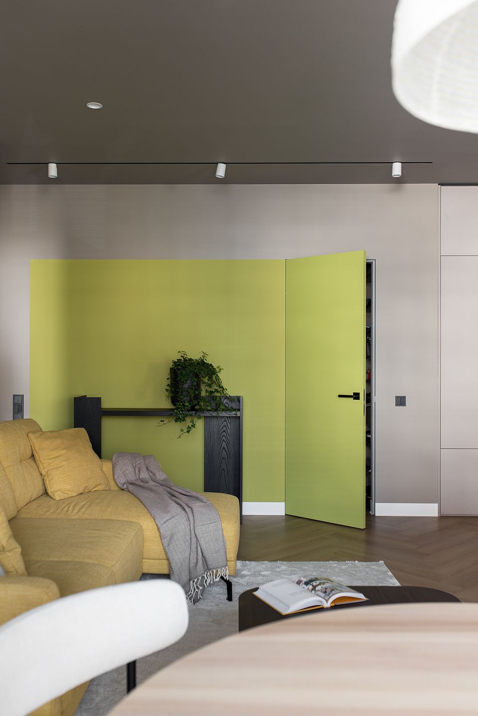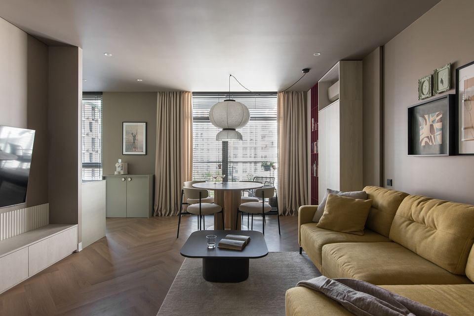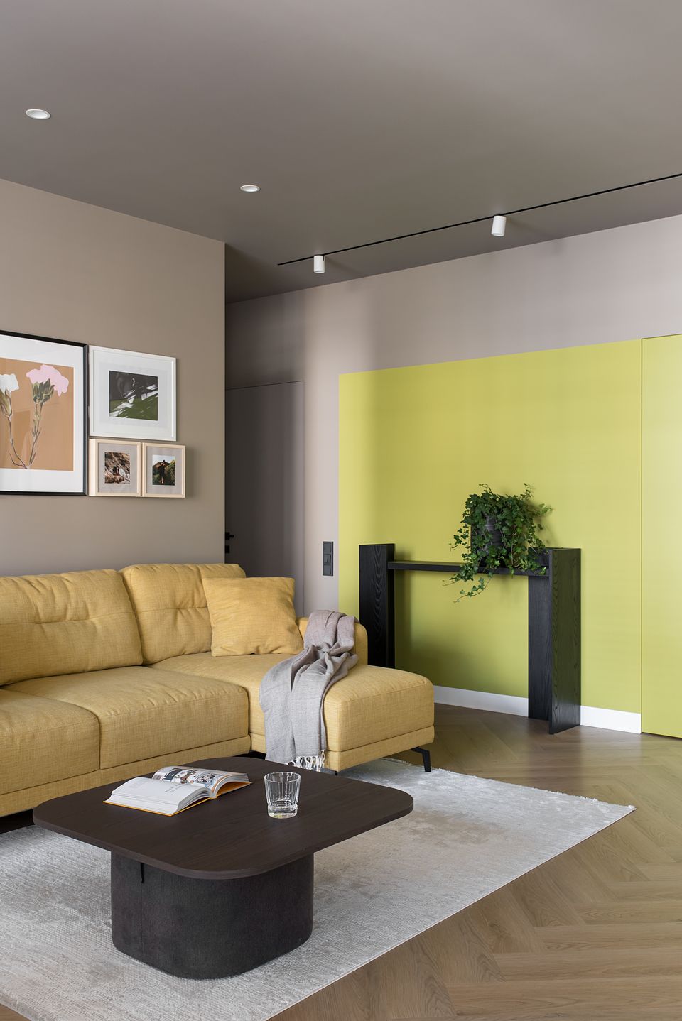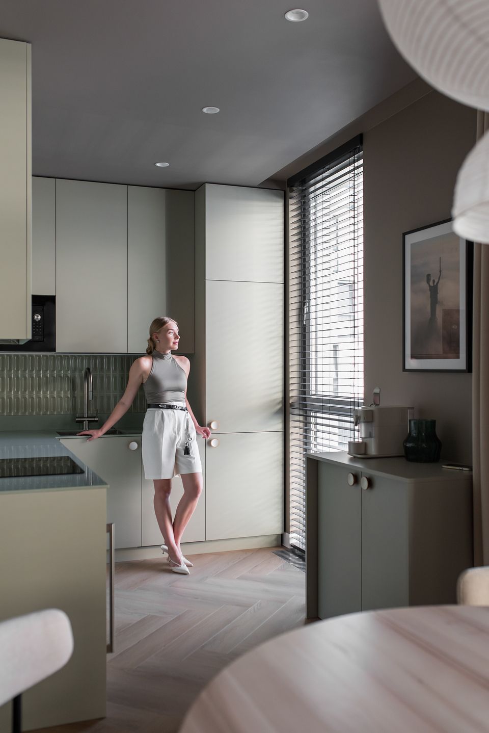 Замовниця — молода, відкрита, оптимістична жінка, мама маленького хлопчика. Її життєва енергія й романтичність відчуваються в кожному відтінку простору. Романтичність — у делікатному рожевому, що перегукується з гірчичним у спальні. Глибина — у хамелеонному бежево-сірому тоні вітальні, який змінюється залежно від світла й погоди. Неординарність — у салатових акцентах і геометрії плитки. Разом вони створюють рівновагу затишку й сили, м’якої естетики та впевненого характеру.