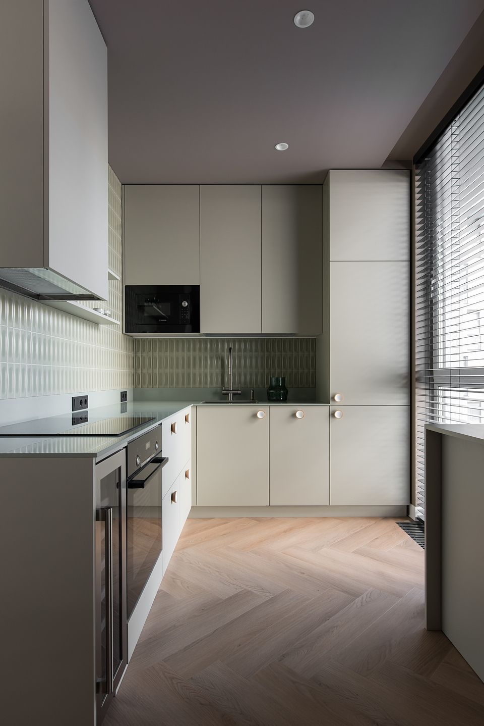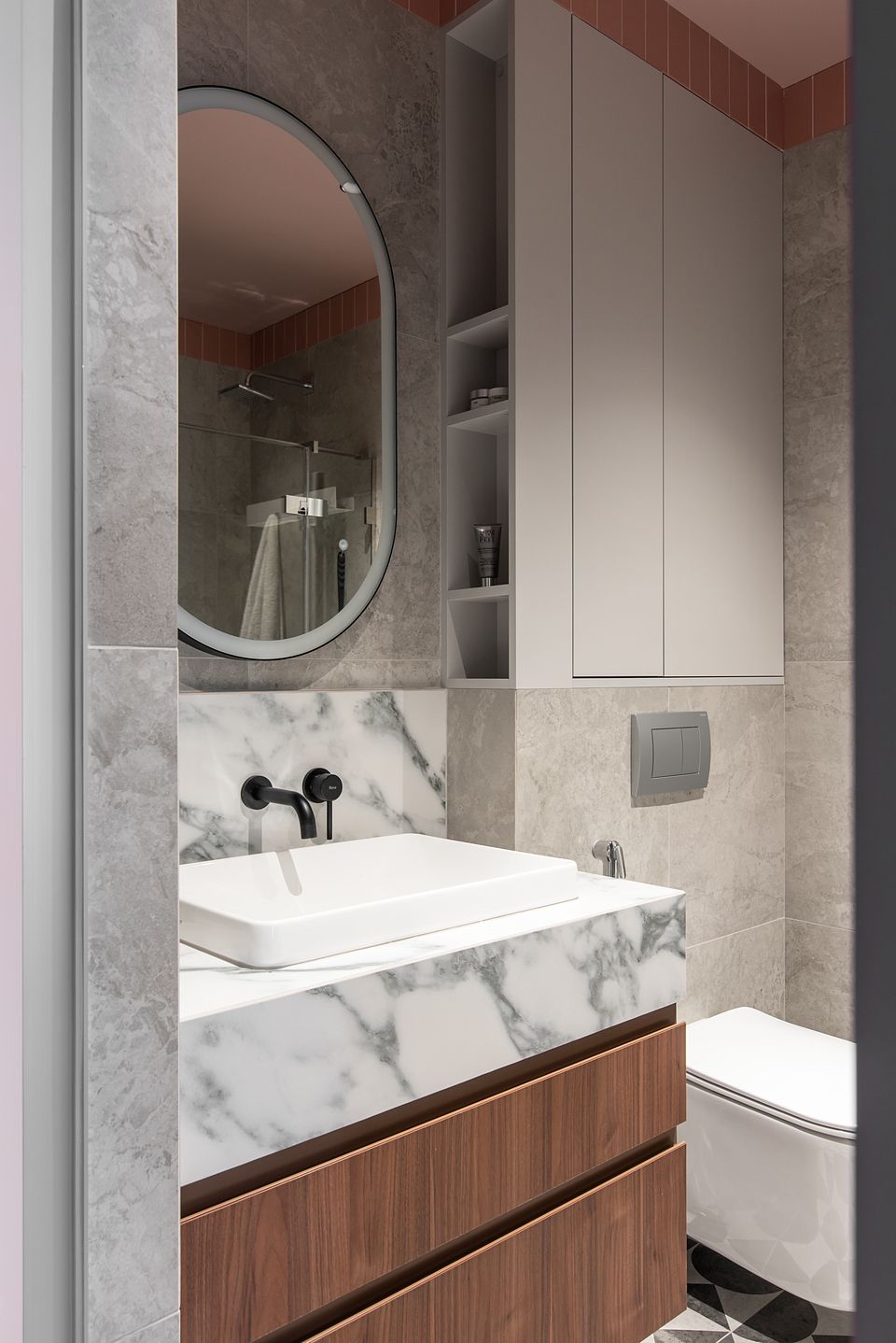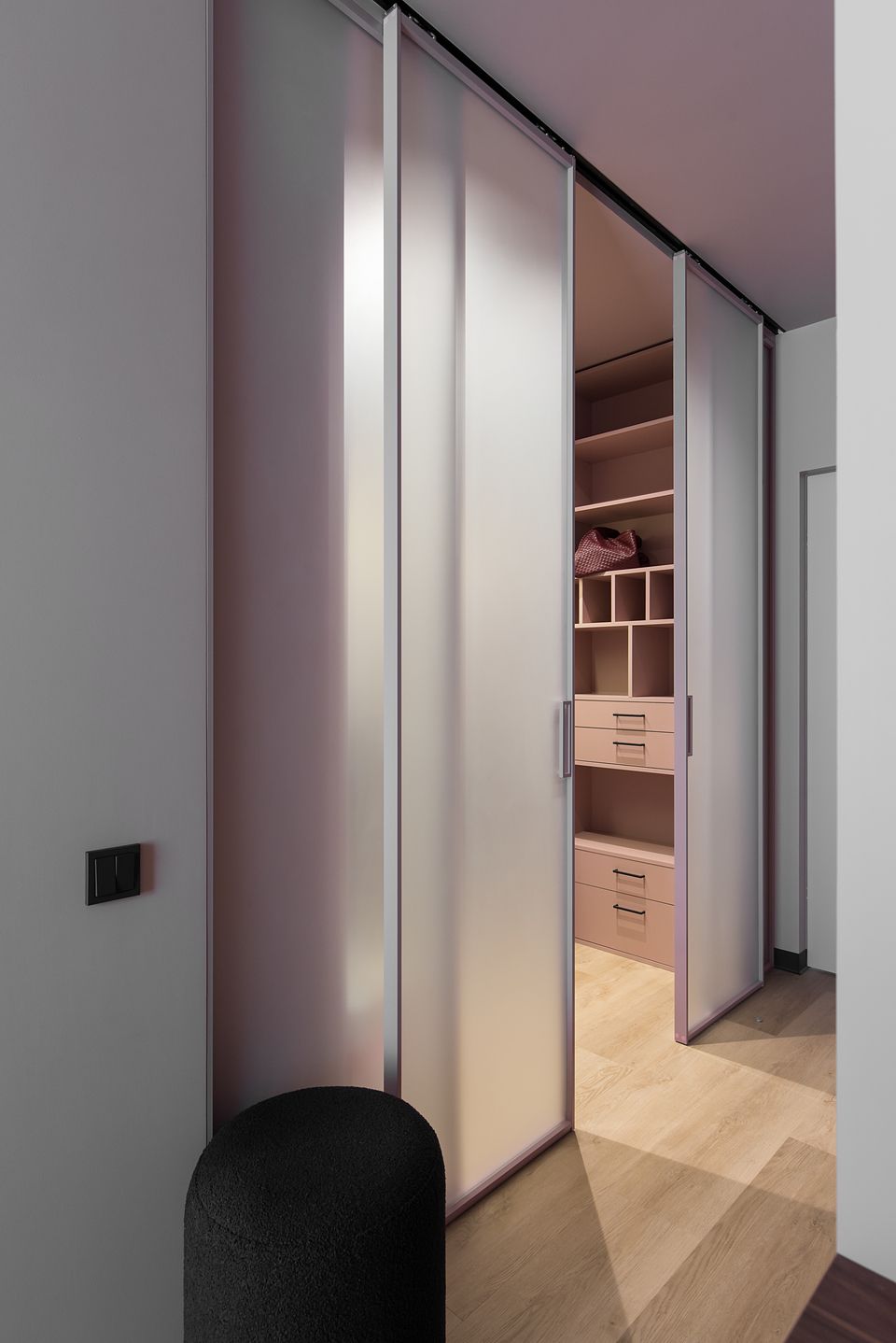 Замовниця — молода, відкрита, оптимістична жінка, мама маленького хлопчика. Її життєва енергія й романтичність відчуваються в кожному відтінку простору. Романтичність — у делікатному рожевому, що перегукується з гірчичним у спальні. Глибина — у хамелеонному бежево-сірому тоні вітальні, який змінюється залежно від світла й погоди. Неординарність — у салатових акцентах і геометрії плитки. Разом вони створюють рівновагу затишку й сили, м’якої естетики та впевненого характеру.