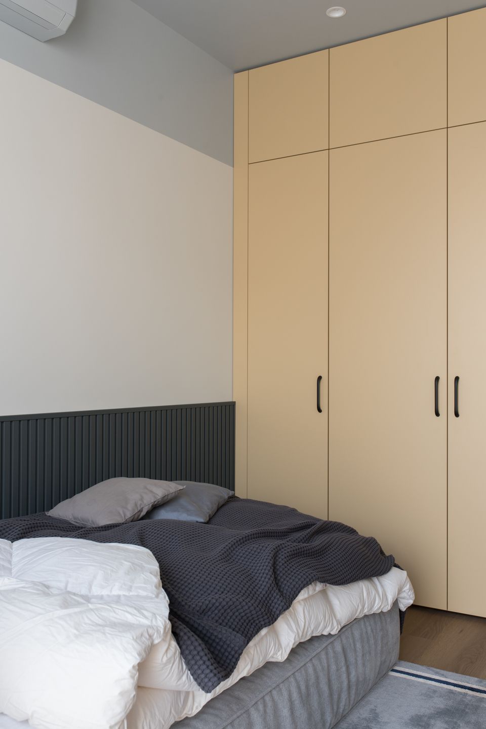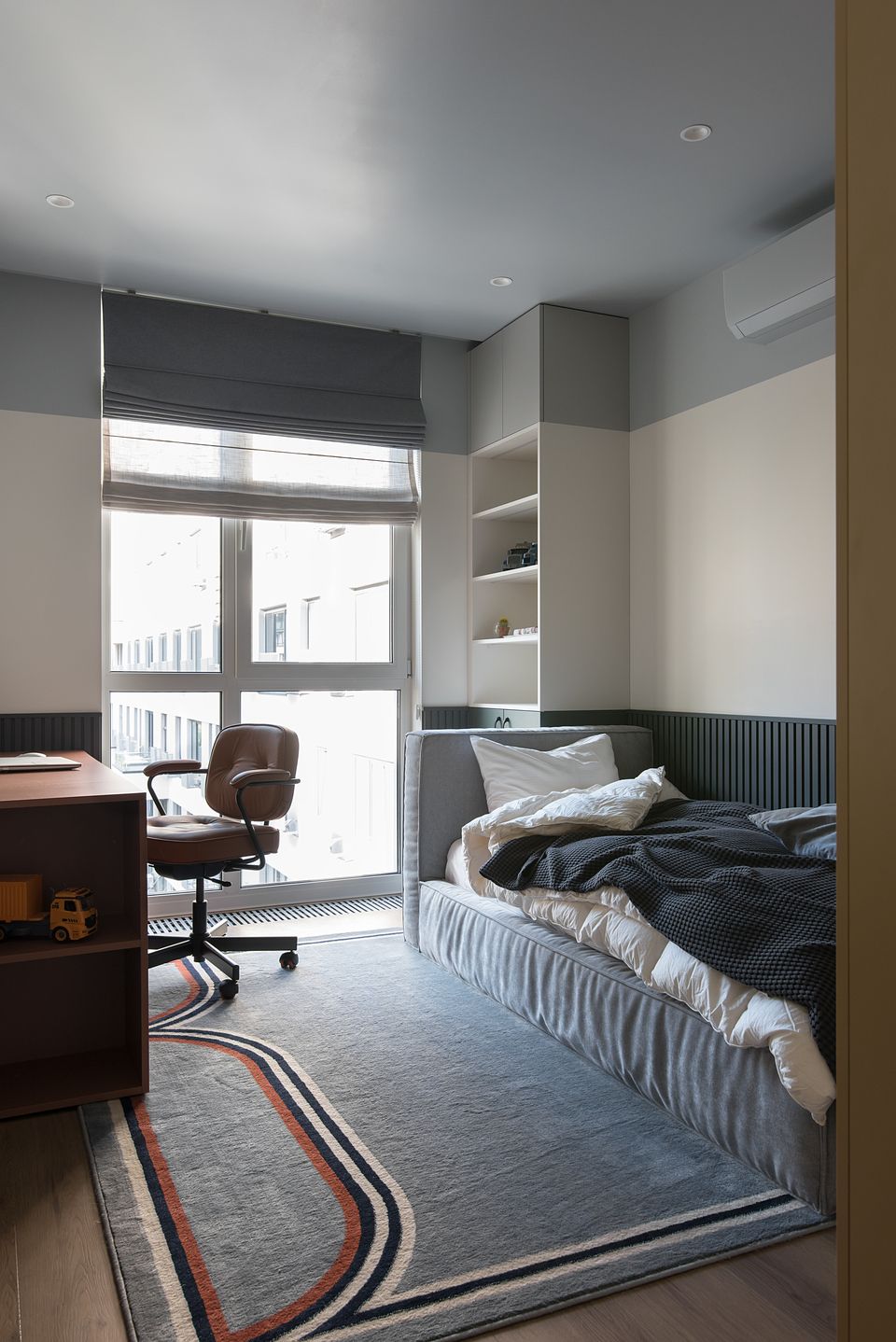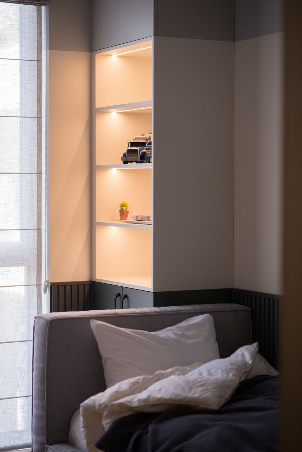 На 74 м² авторці вдалося розмістити все необхідне для комфортного життя молодої сім’ї: дитячу кімнату для шестирічного хлопчика, спальню, кухню-вітальню, дві ванні кімнати та дві гардеробні. Квартира дісталася із чорновим ремонтом, тож робота почалася з адаптації простору: оновлення розеткових точок, продумування нового планування меблів, створення корпусних елементів і грамотного освітлення. До команди запросили світлодизайнера, завдяки чому світло стало одним із головних інструментів формування атмосфери — особливо у вечірній час.
