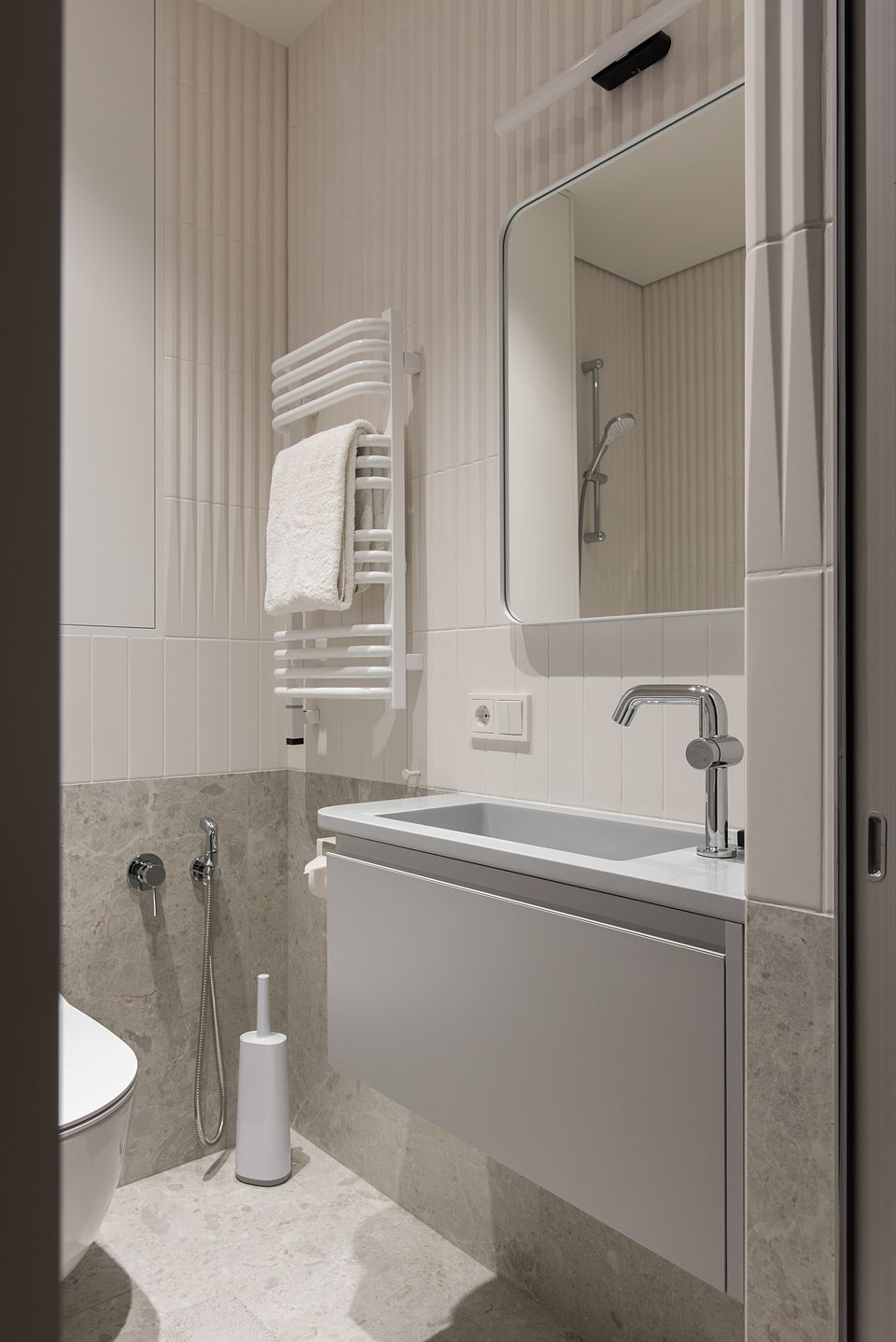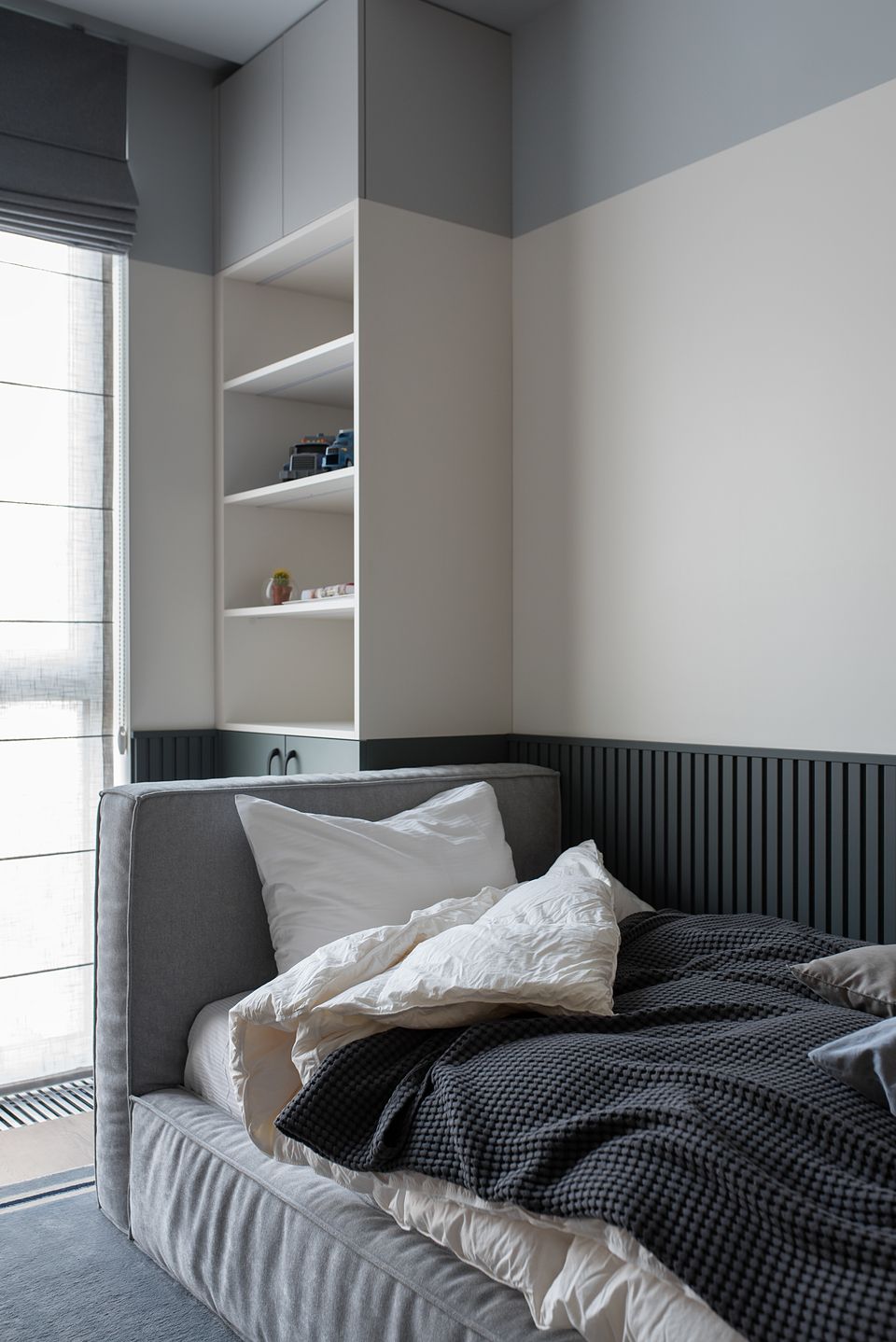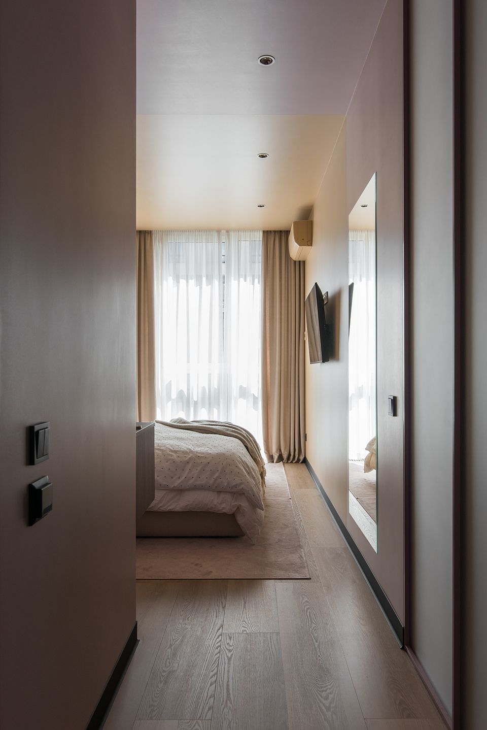 На 74 м² авторці вдалося розмістити все необхідне для комфортного життя молодої сім’ї: дитячу кімнату для шестирічного хлопчика, спальню, кухню-вітальню, дві ванні кімнати та дві гардеробні. Квартира дісталася із чорновим ремонтом, тож робота почалася з адаптації простору: оновлення розеткових точок, продумування нового планування меблів, створення корпусних елементів і грамотного освітлення. До команди запросили світлодизайнера, завдяки чому світло стало одним із головних інструментів формування атмосфери — особливо у вечірній час.