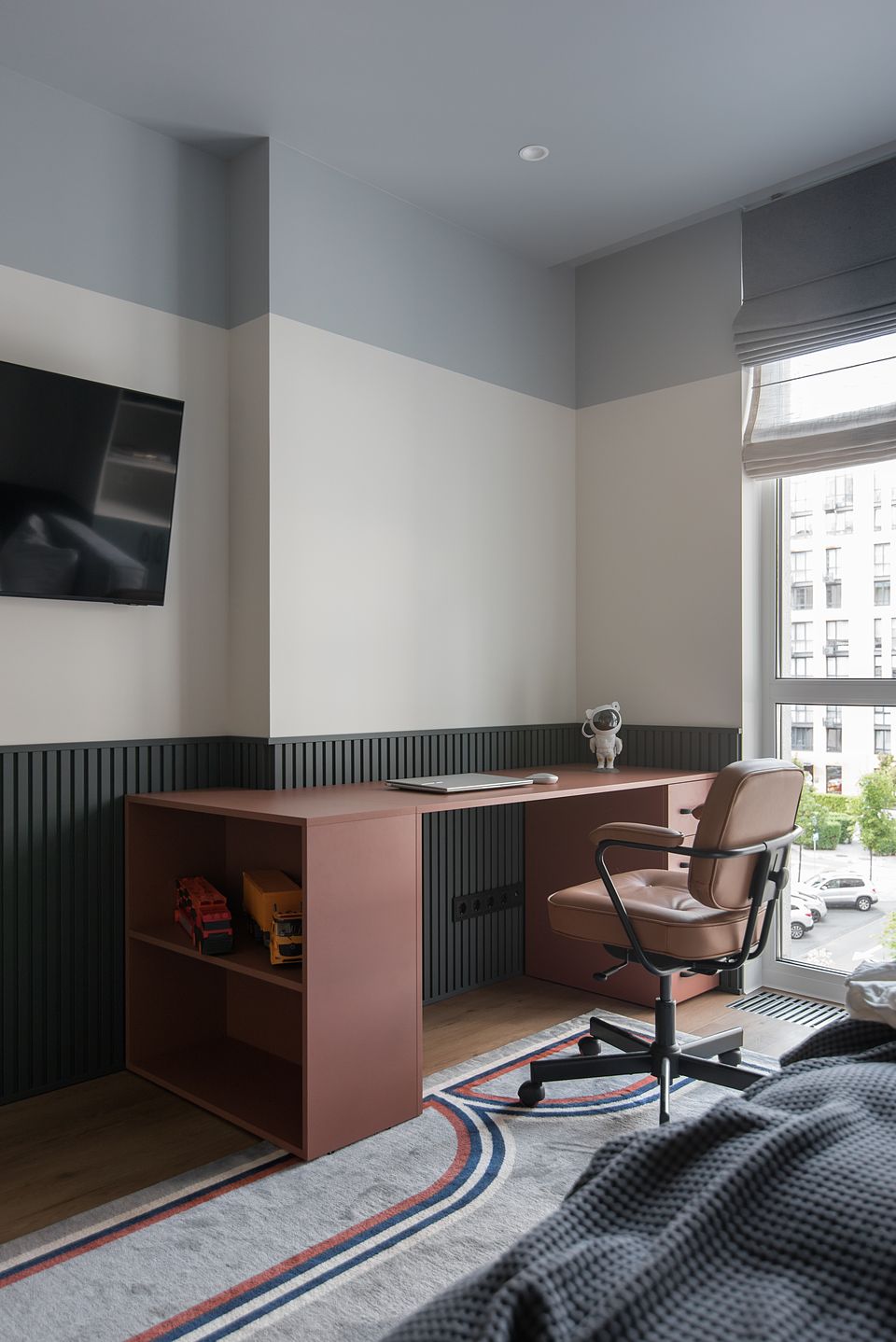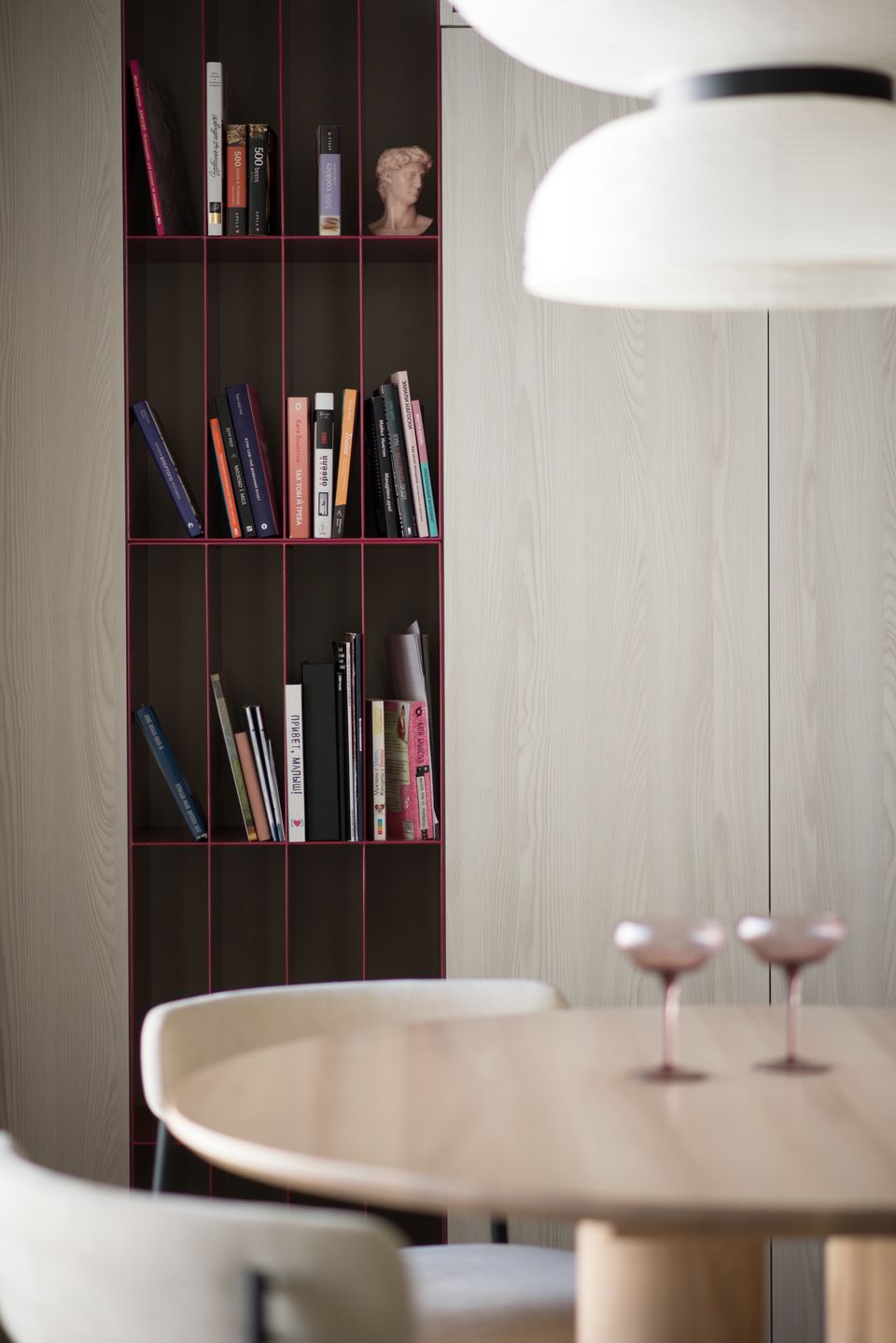 Ключовою особливістю стала моноколірна кухня з ДСП готового відтінку, акриловою стільницею Corian та геометричним ритмом плитки Marazzi. Стіни у вітальні пофарбовані антивандальною фарбою Benjamin Moore — практичне рішення, яке не жертвує естетикою. Окремої уваги заслуговує вишневий металевий стелаж, створений на замовлення. Він став не лише акцентом, а й технічним викликом: при товщині металу в кілька міліметрів конструкція важить близько 50 кг — справжнє поєднання дизайну та інженерії.