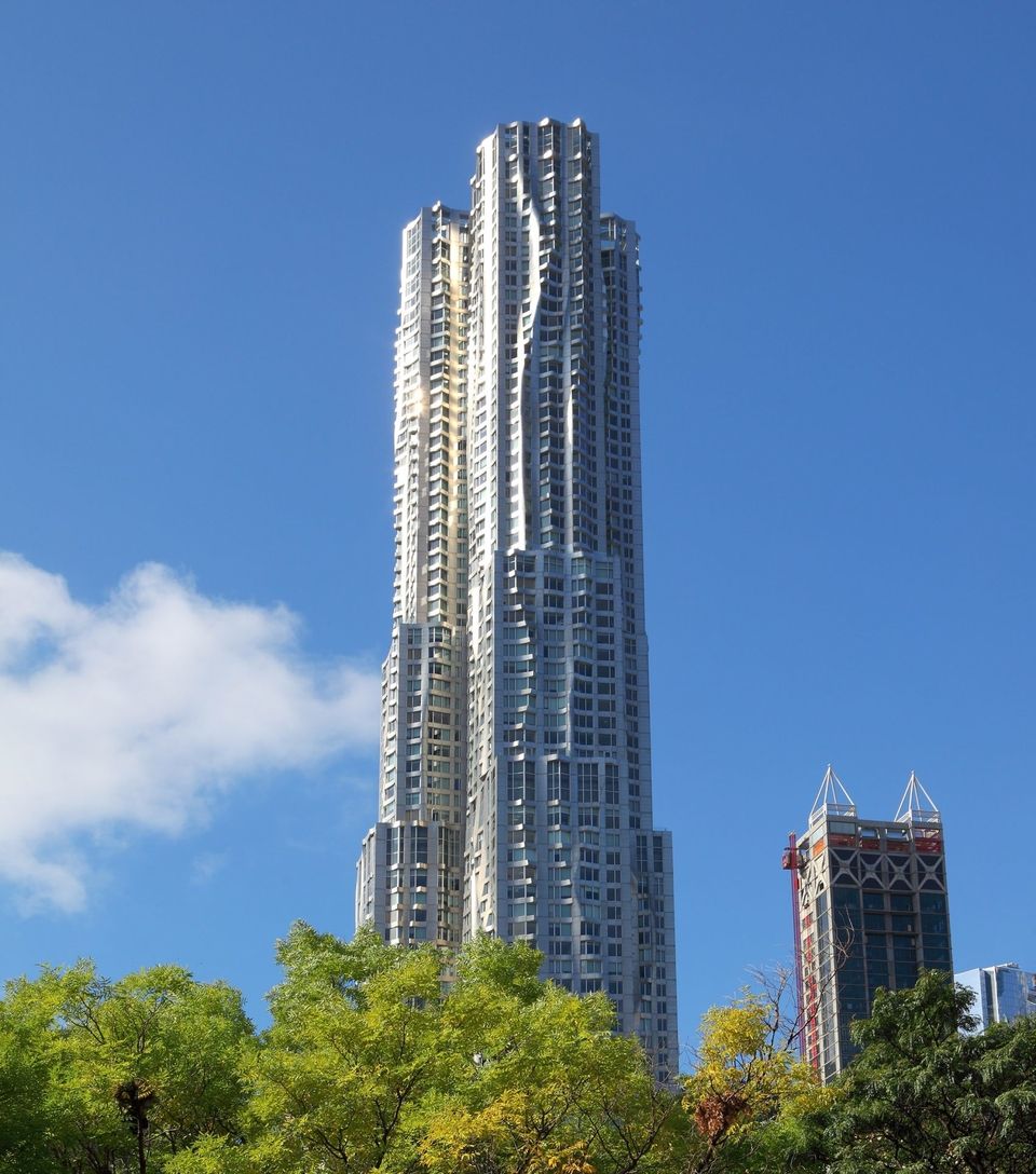 Перша вежа Ґері в Нью-Йорку: 265-метровий житловий хмарочос із характерними «зім’ятими» фасадами. Деформація поверхні створює унікальні світлові ефекти та відкриває панорамні видові кути.