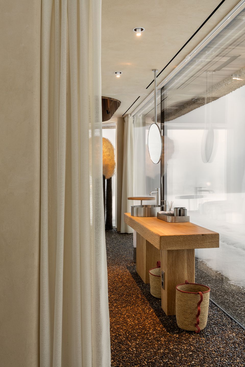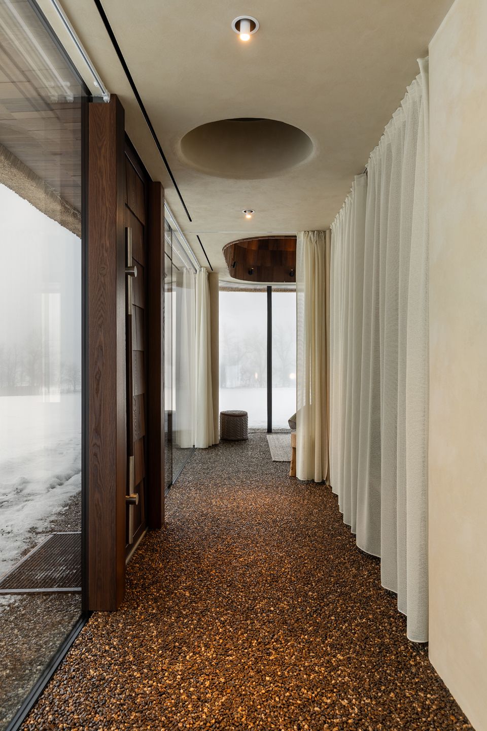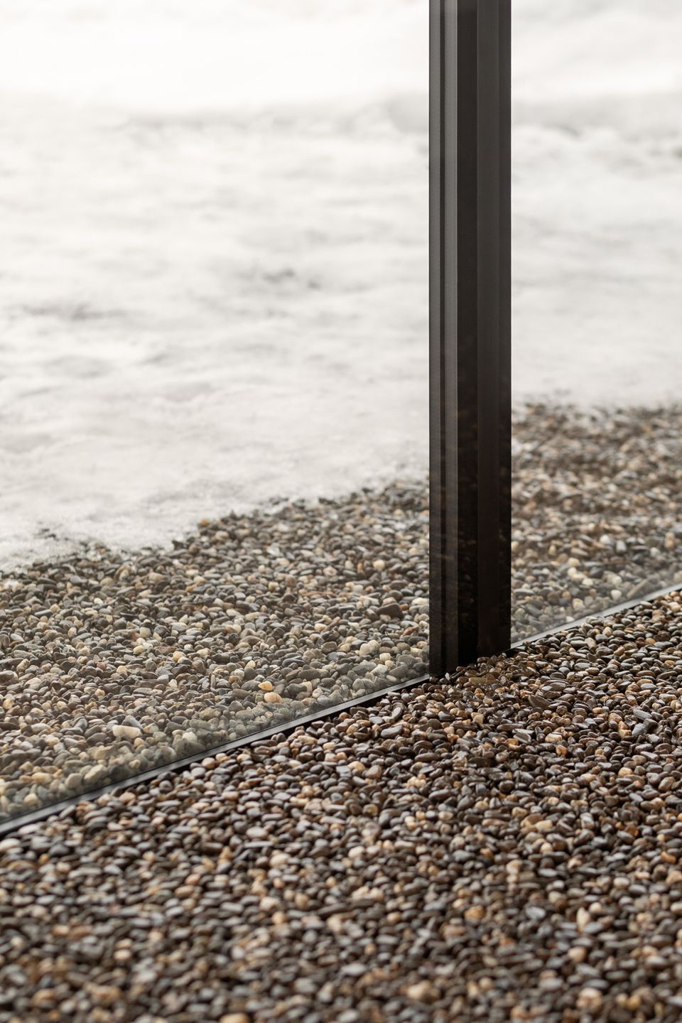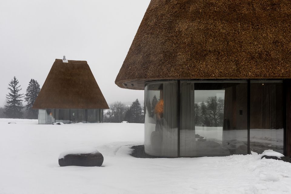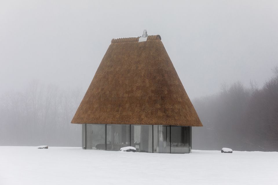 Удень суцільне скління майже розчиняє межу між інтер’єром і ландшафтом, створюючи ілюзію, ніби масивний очеретяний дах левітує над землею. Кам’яно-килимове покриття, використане і всередині, і зовні, підсилює відчуття цілісності простору та додає тілесного досвіду — м’якого, природного, тактильного.