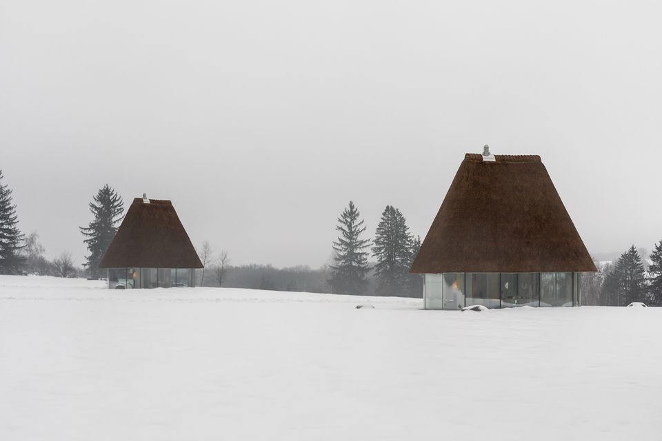 Проєкт Hata-Mazanka від української архітектурної студії YOD Group — це спроба подивитися на традиційну українську хату без фольклорної дистанції. Не як на образ із минулого, а як на працюючий архетип — просторову формулу тиші, захисту й співіснування з ландшафтом. Розташовані в центральній частині України гостьові будинки «Під очеретяним дахом» не відтворюють форму хати буквально. Натомість автори проєкту переосмислюють її ключові риси — масивний дах, світло, відчуття прихистку — перекладаючи їх мовою сучасної архітектури. Тут культурна пам’ять стає не декором, а інструментом проєктування.
