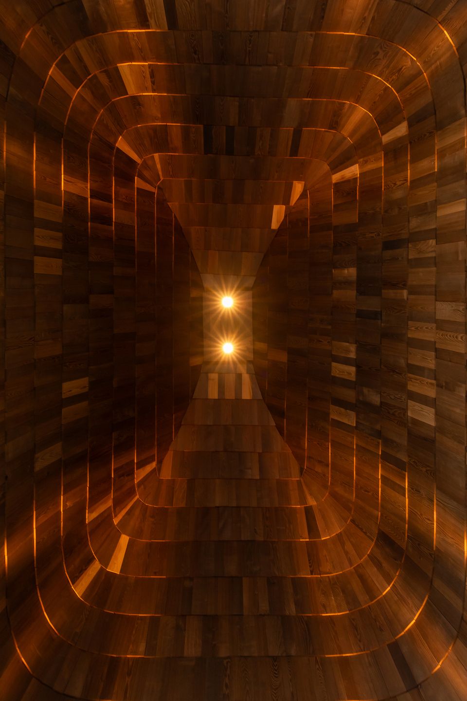 Внутрішній купол даху оздоблений дерев’яною черепицею, що імітує традиційний гонт. Купольна конструкція висотою до 10 метрів наповнює простір повітрям і світлом, водночас дозволяючи повністю приховати інженерні системи.