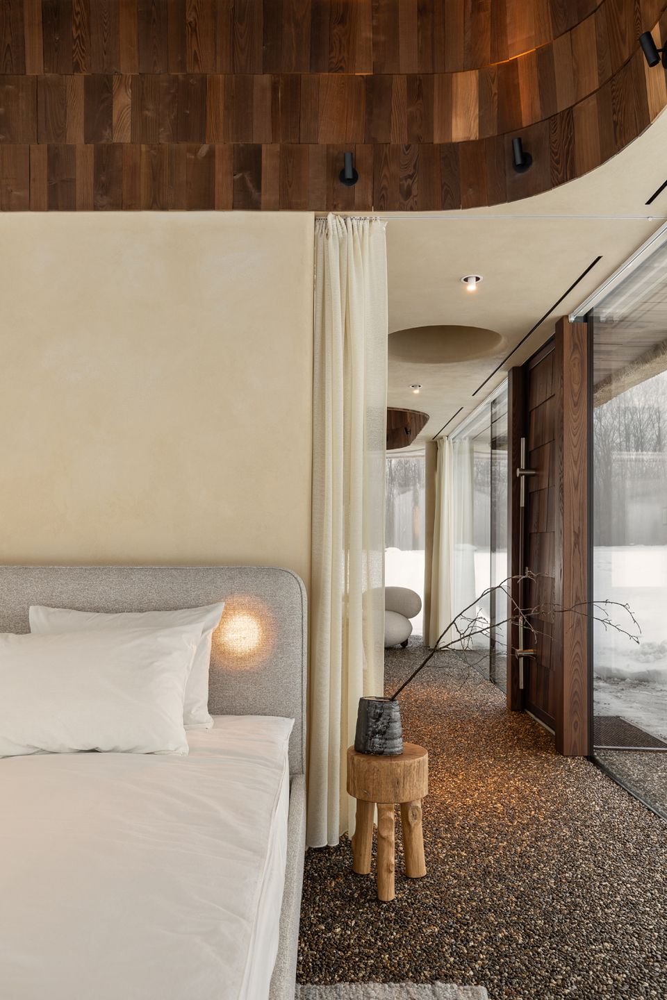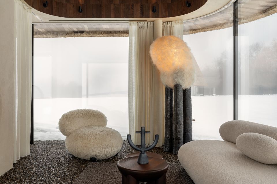 Телевізора тут немає принципово. Замість нього — живий вогонь, круглий отвір каміна та безперервний візуальний контакт із природою. Простір працює як інструмент сповільнення, інформаційного детоксу та відновлення.