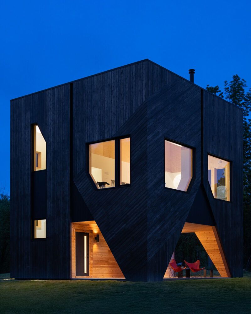 Темна фасадна обшивка з контрастними чорними металевими деталями робить будівлю стриманою зовні, а світлий і теплий інтер’єр додає відчуття спокою всередині.