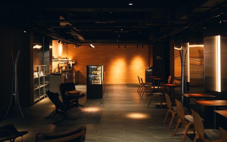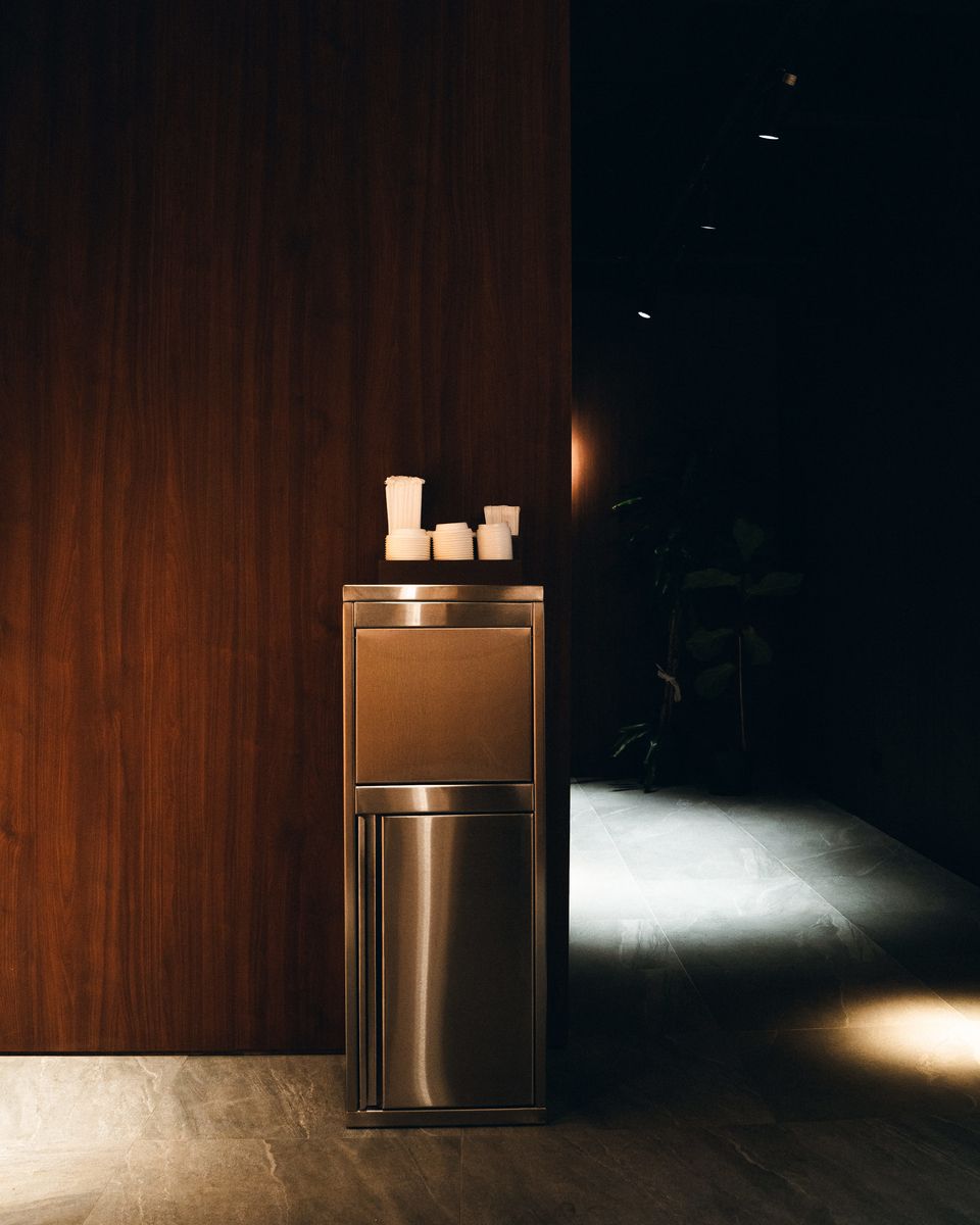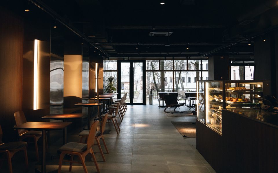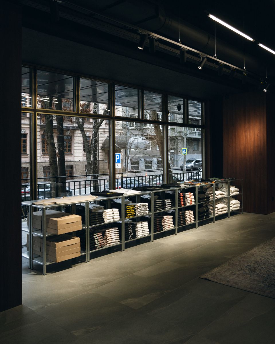 Дизайн-концепція побудована на камерності, тактильності та роботі з природними матеріалами. Стіни оздоблені темним деревом, що формує теплу, зібрану атмосферу, а панелі з нержавіючої сталі в зоні кав’ярні додають ритму та працюють зі світлом. Світлові рішення реалізовані у співпраці з українською компанією Expolight, яка працює з повним циклом створення освітлення.