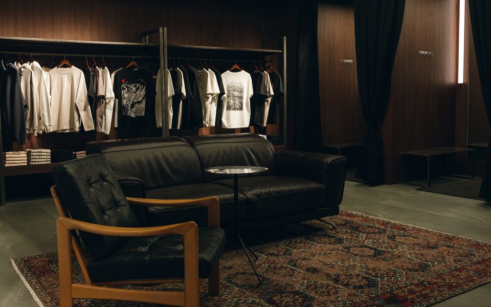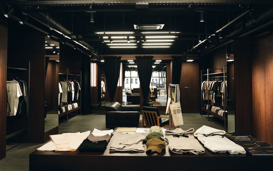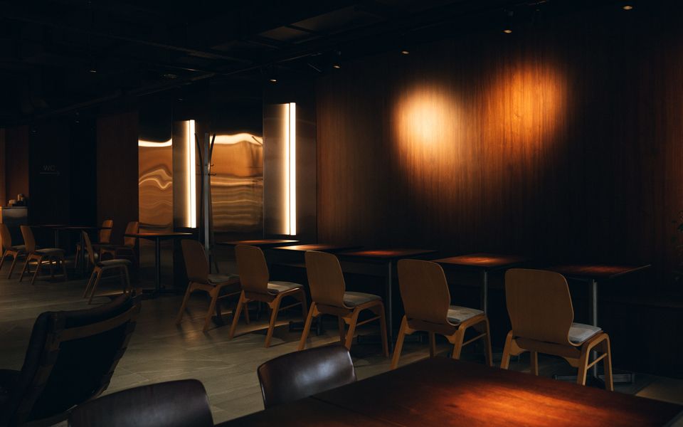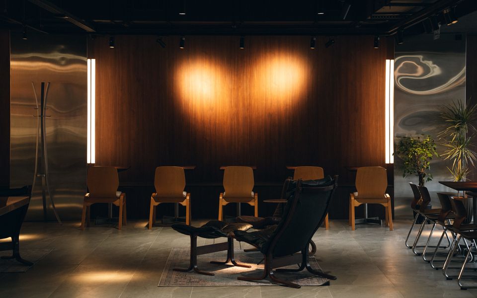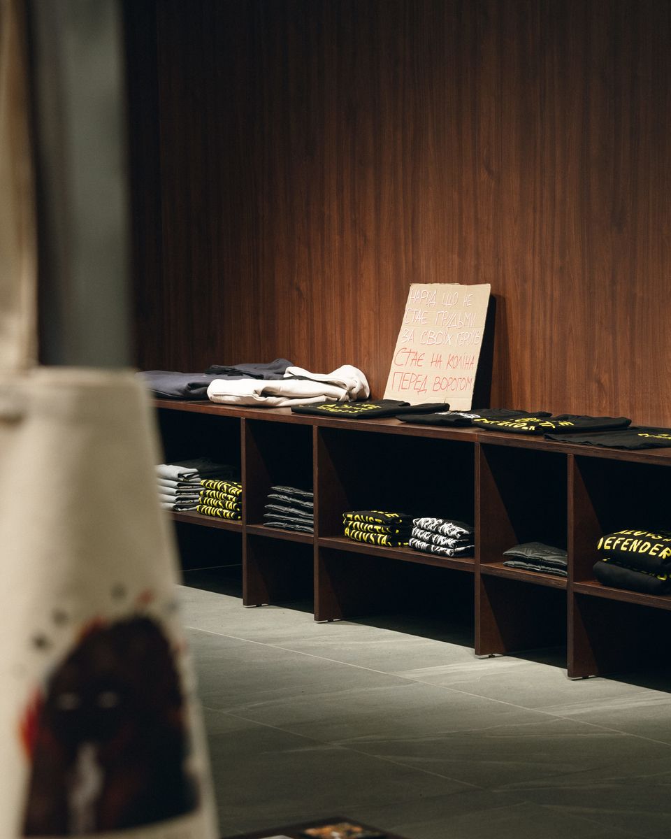 Дизайн-концепція побудована на камерності, тактильності та роботі з природними матеріалами. Стіни оздоблені темним деревом, що формує теплу, зібрану атмосферу, а панелі з нержавіючої сталі в зоні кав’ярні додають ритму та працюють зі світлом. Світлові рішення реалізовані у співпраці з українською компанією Expolight, яка працює з повним циклом створення освітлення.