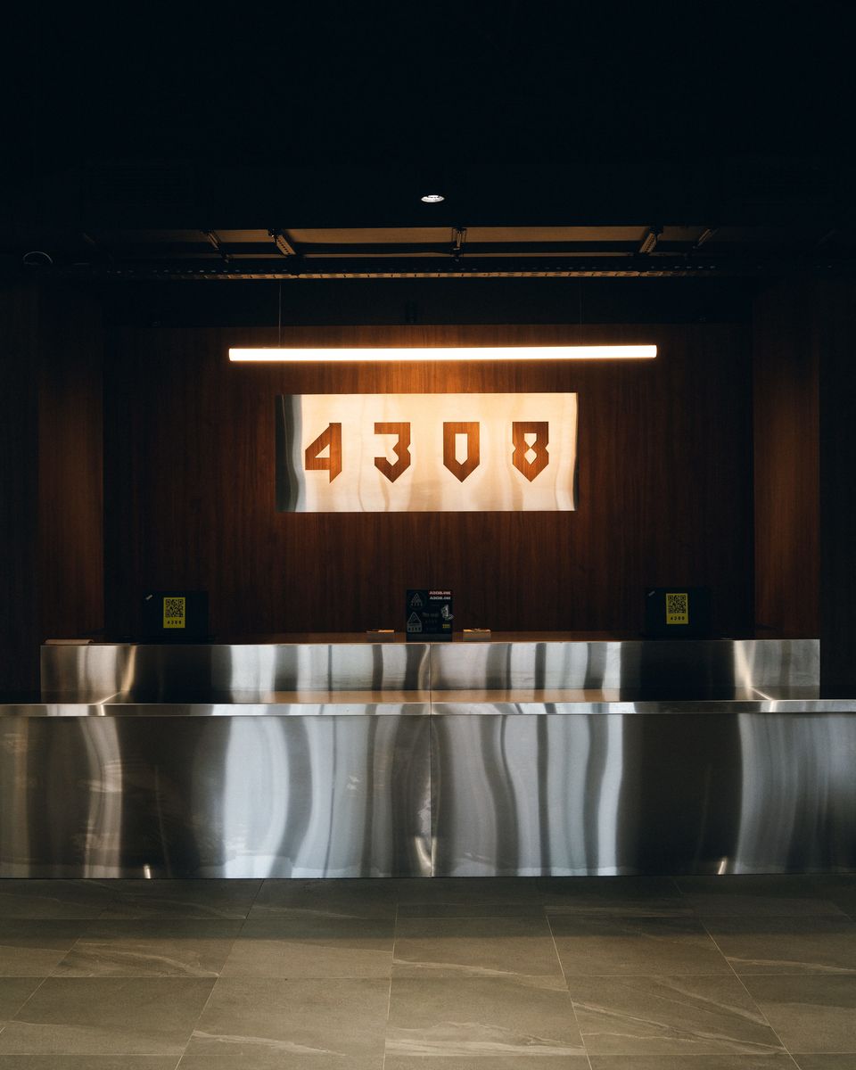 Широка каса візуально розділяє магазин і кав’ярню, водночас єдине оздоблення об’єднує простір. Магазин трансформується у лекторій з екраном і місцями для глядачів, що робить hub.4308 місцем подій, зустрічей і обміну досвідом. В естетиці проєкту відчутний вплив британської традиції стриманої елітарності — увага до пропорцій, характеру та відчуття часу. Інтер’єр поєднує зібрану маскулінність із теплом і камерністю, залишаючись сучасним за формою та позачасовим за настроєм.