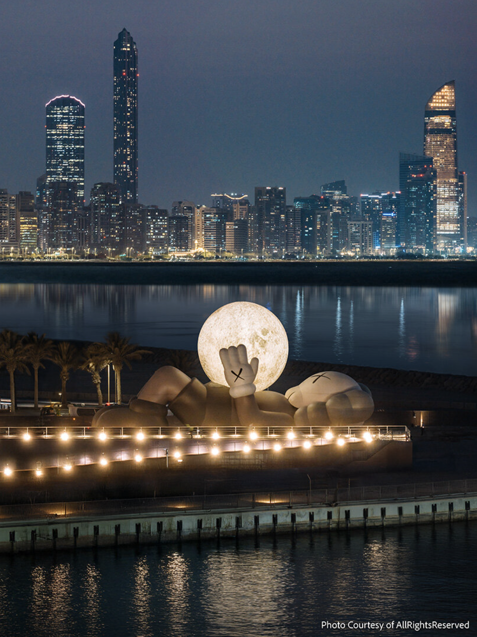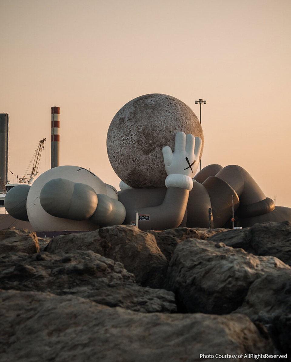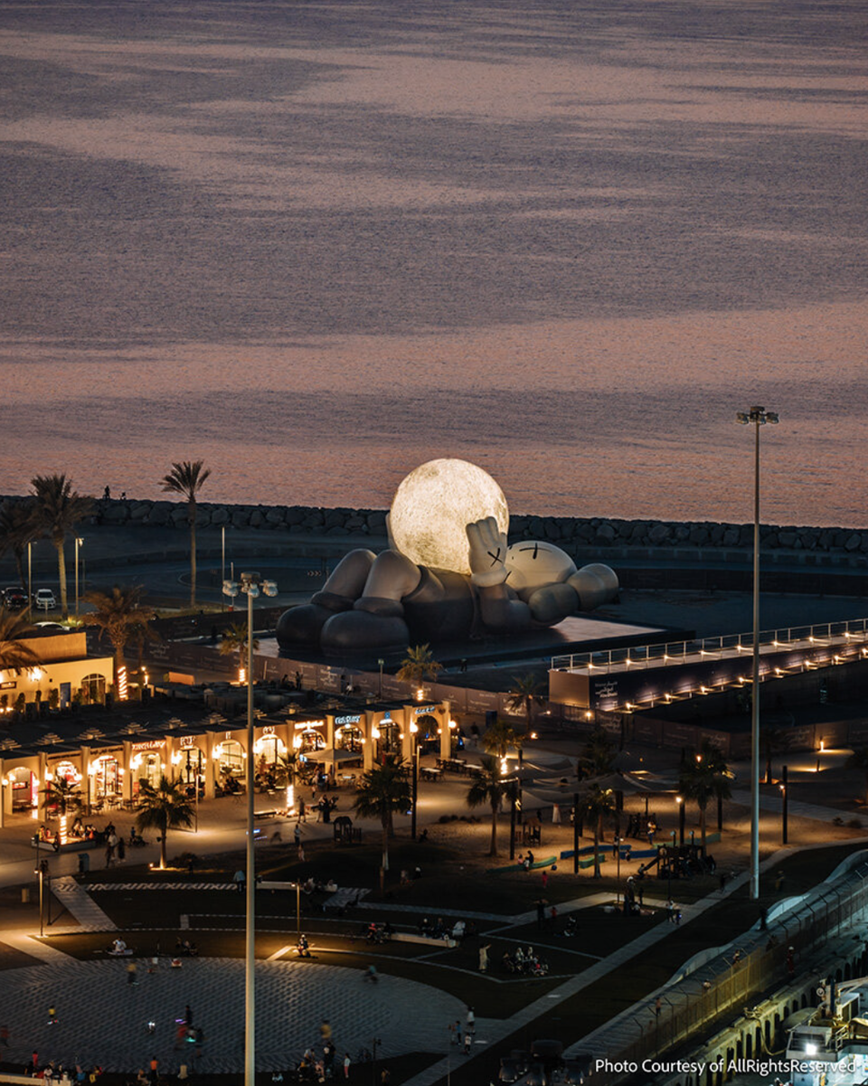 На узбережжі Міни Заєд в Абу-Дабі з’явилася нова масштабна робота KAWS — KAWS:HOLIDAY Abu Dhabi, створена у співпраці з AllRightsReserved. 32-метровий Companion цього разу не пливе, а лежить уздовж води, ніби зробив паузу, піднімаючи до неба світну сферу-місяць. Інсталяція стала однією з ключових подій Manar Abu Dhabi 2025, міського фестивалю світлового мистецтва, що триватиме до 4 січня 2026 року.