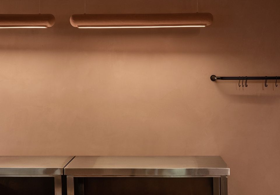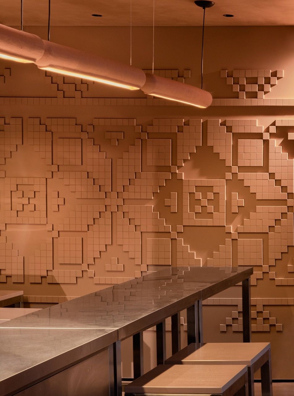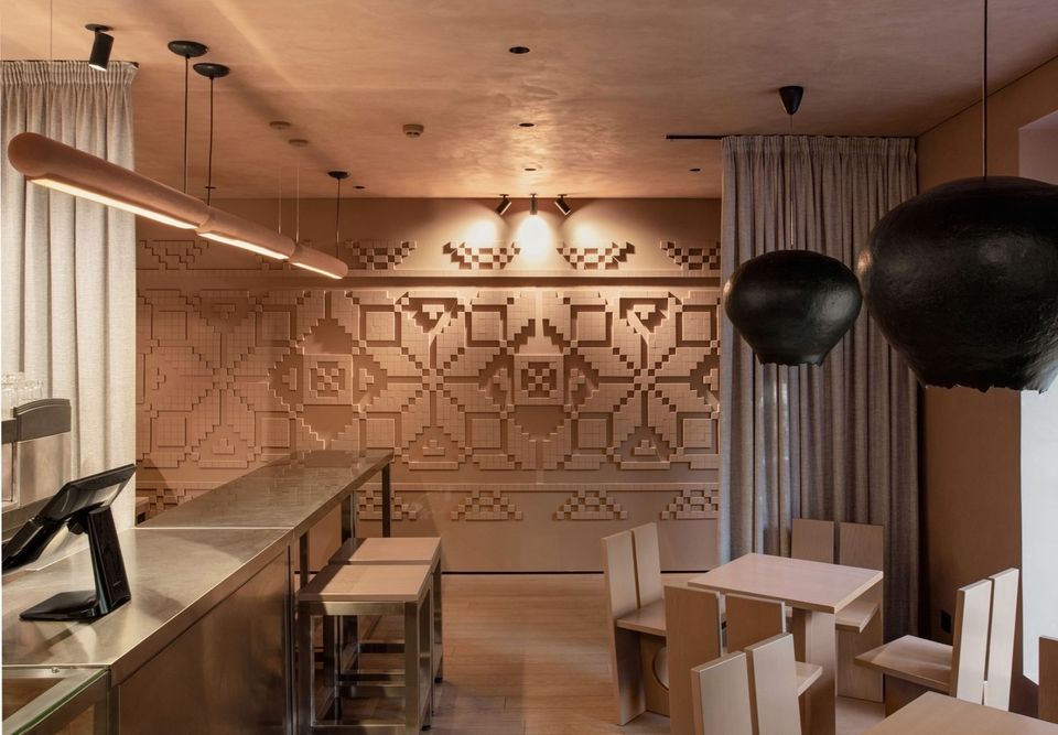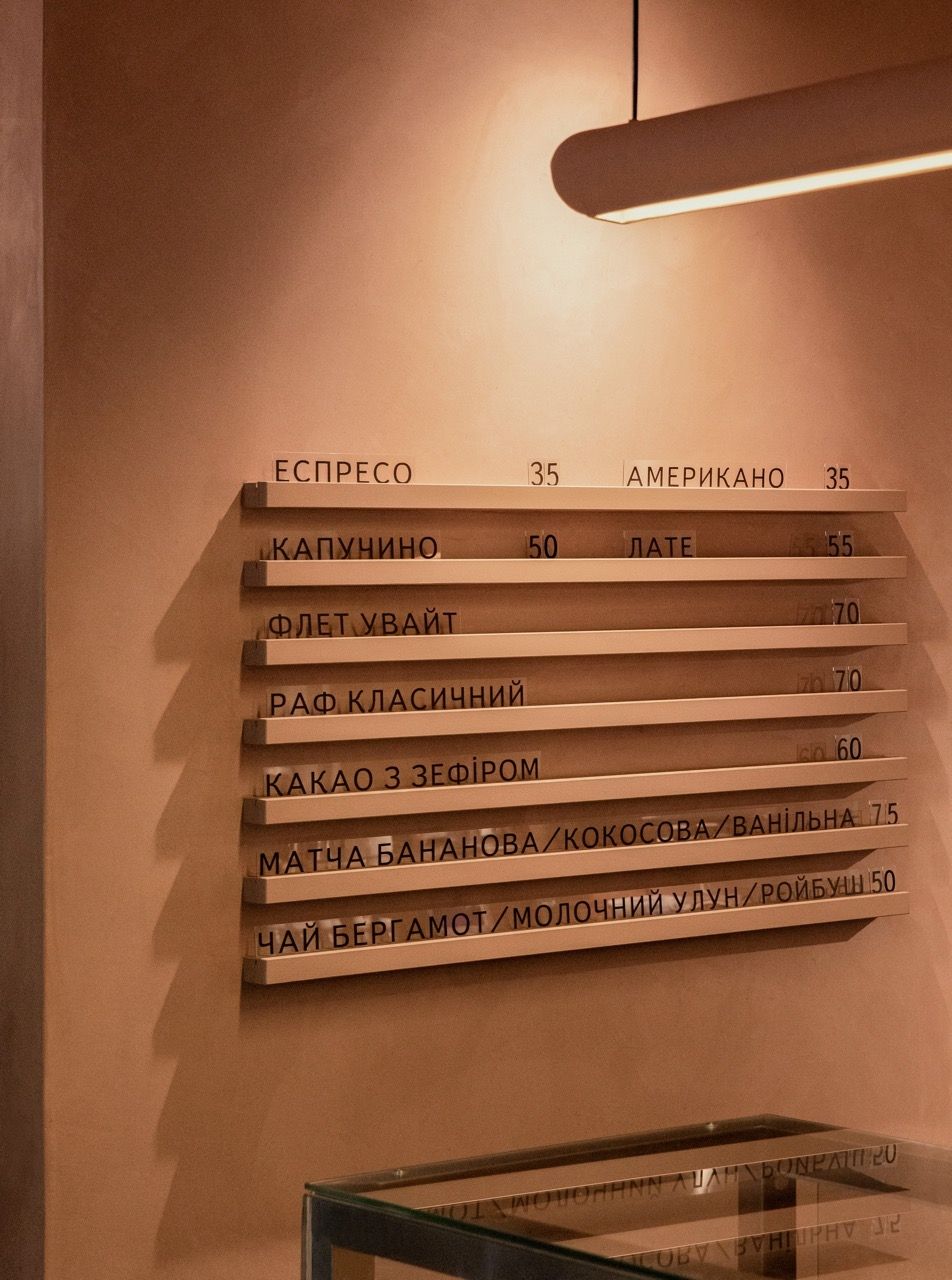 Ключову роль у сприйнятті простору відіграє фактура. Поверхні стін і стелі нерівні, живі, вони по-різному реагують на світло і дотик. У цьому рельєфі можна вловити асоціації з шарами еспресо та молока в чашці капучино. Центральна стіна з авторським орнаментом MAKHNO інтерпретує мотиви української вишивки, додаючи простору культурної глибини і делікатного зв’язку з традицією.