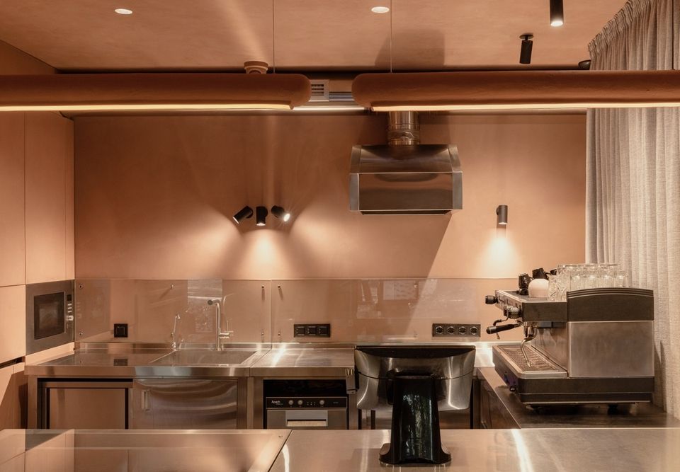 Контрастом до цієї м’якої, майже тактильної оболонки виступає робоча зона бариста. Барна стійка та робочі поверхні виконані з хромованої сталі — матеріалу функціонального і чесного, який підкреслює відкритість процесу приготування кави. У цьому поєднанні теплої фактури і холодного металу простір знаходить баланс між емоцією і точністю.