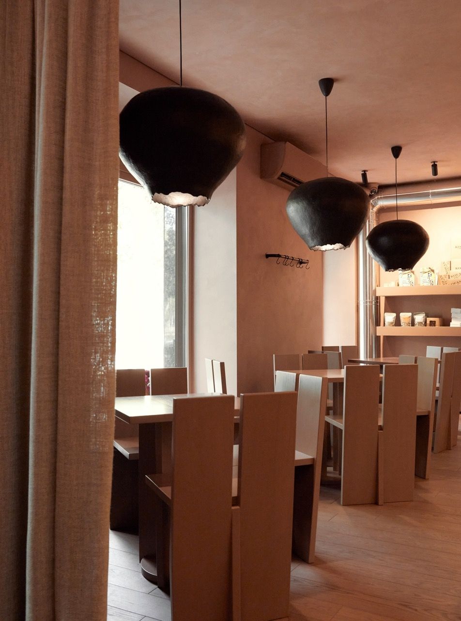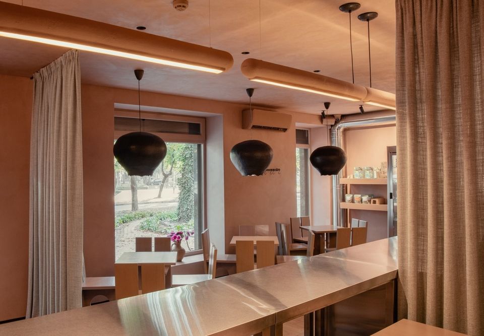 Деталі тут працюють не як окремі акценти, а як частина єдиної системи. Меблі з масиву дерева, світильники GARLIK над столиками, довгі керамічні лампи FLEITA у зоні бариста — всі ці елементи підтримують атмосферу, не перетягуючи увагу на себе.