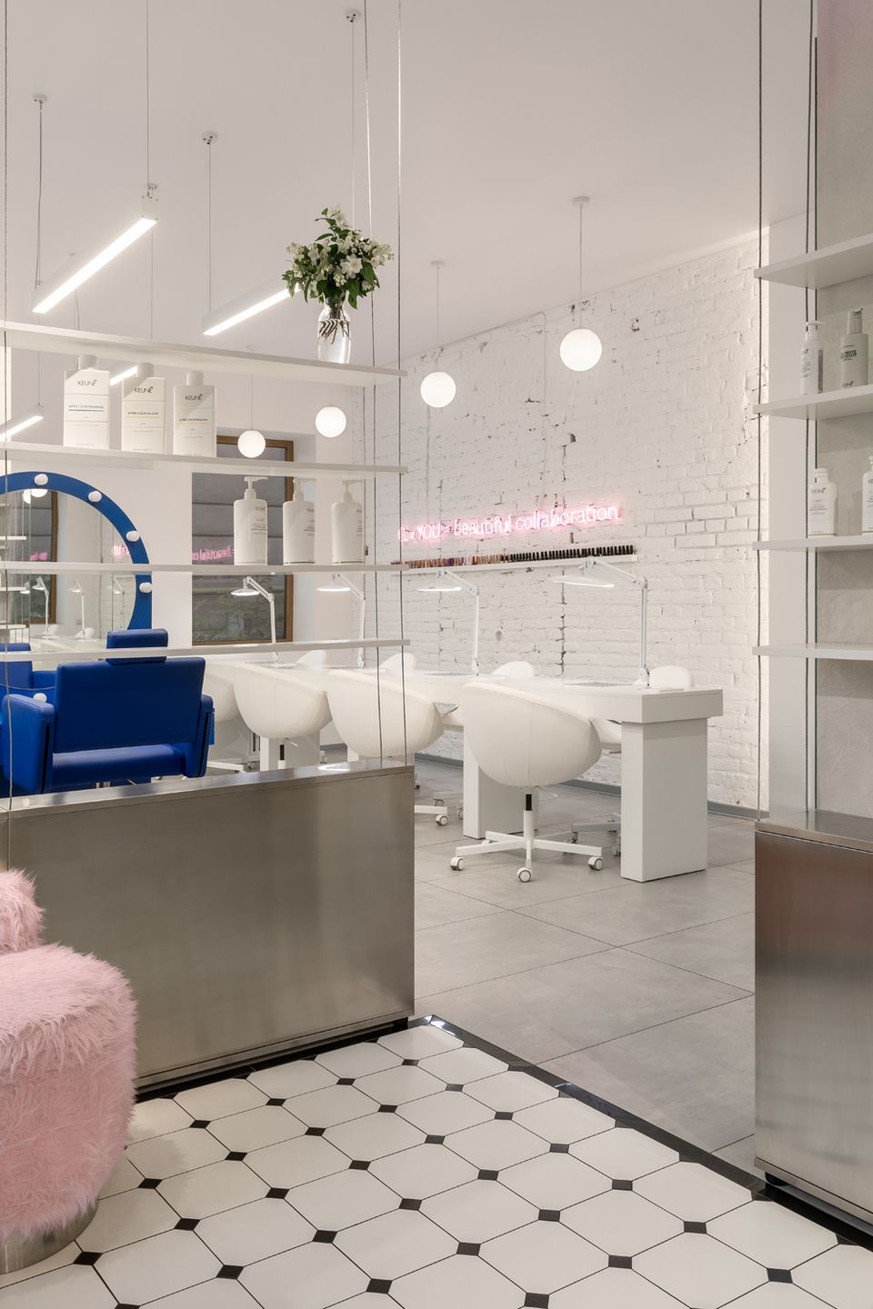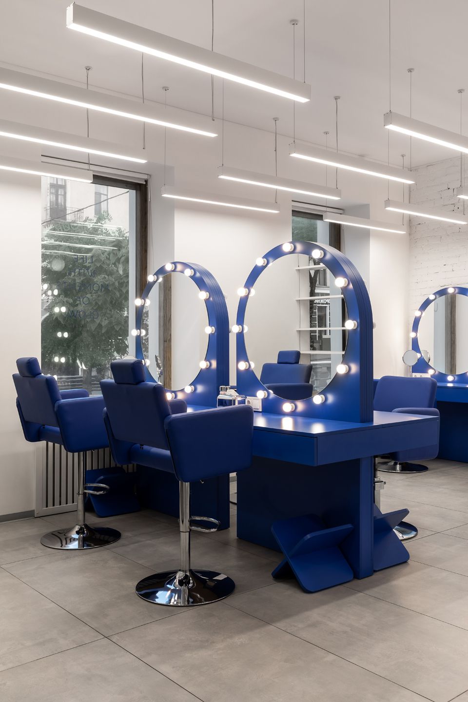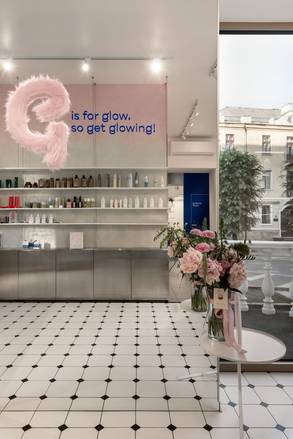 Новий G×BAR, розроблений студією HVYLYA interior design, розташований у центрі Тернополя на площі 82 м². У просторі продумано організовані робочі зони: станції для волосся і нігтів розміщені біля вікон, що додає атмосфері динаміки, а зони для педикюру та миття голови знаходяться далі, забезпечуючи необхідну приватність.