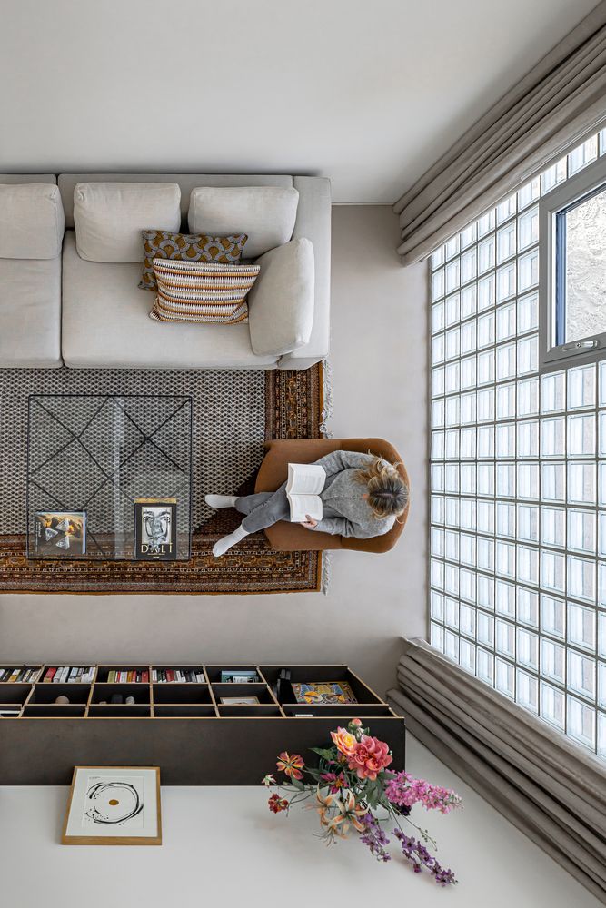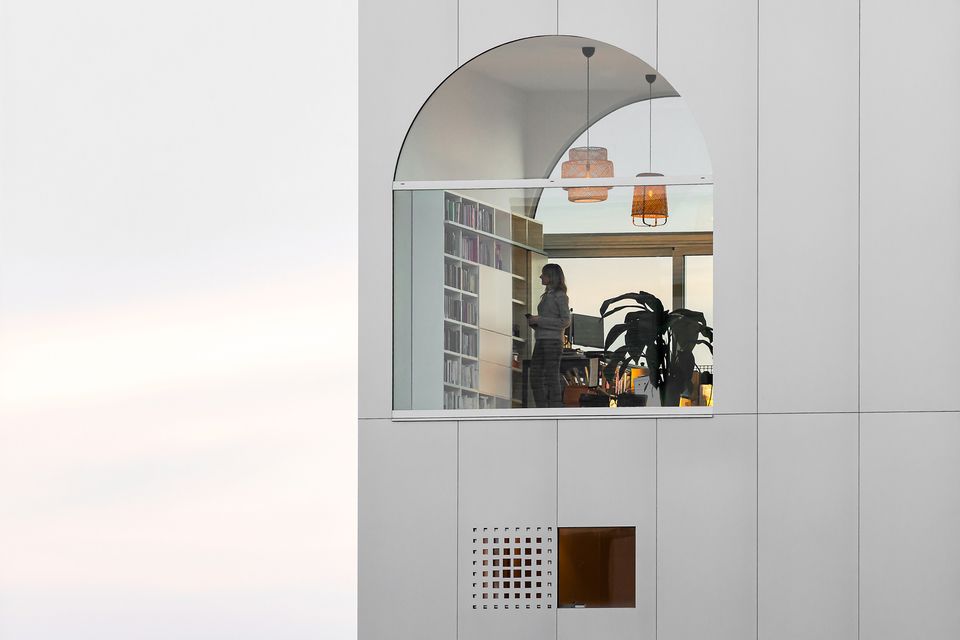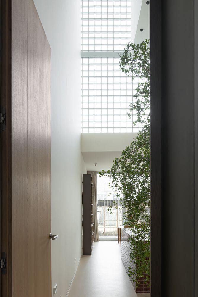 Нижня частина будівлі захована за фасадом зі скляних блоків. Вони пропускають світло глибоко всередину, водночас розмиваючи видимість іззовні. Це створює баланс між відкритістю і приватністю: життя всередині читається, але не розкривається повністю.