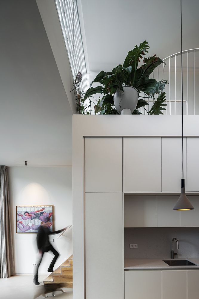 Центральною точкою стає кухня — «серце» дому. Над нею ніби зависає окремий об’єм, що функціонує як приватний простір для читання, йоги чи усамітнення. На самому верху, на висоті 14 метрів, розташована найбільш відкрита зона — своєрідний «будинок для відпочинку» всередині дому. Вона виходить на терасу з панорамним видом на озеро IJmeer, поєднуючи інтер’єр із ландшафтом.