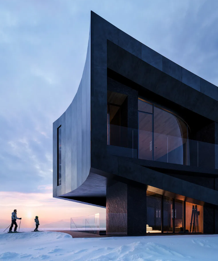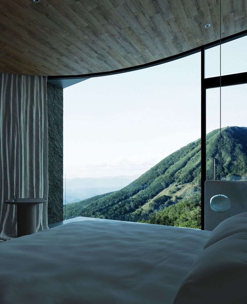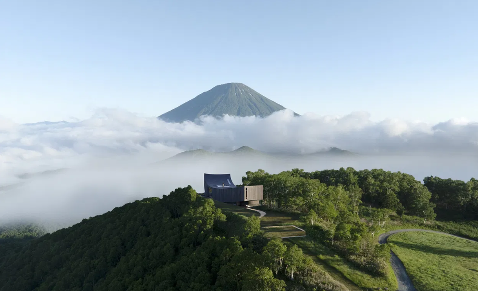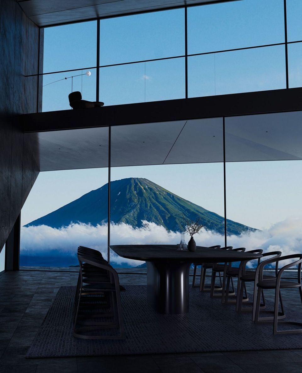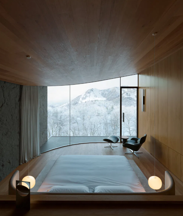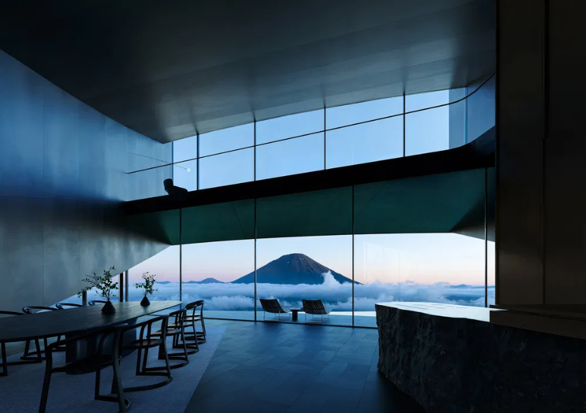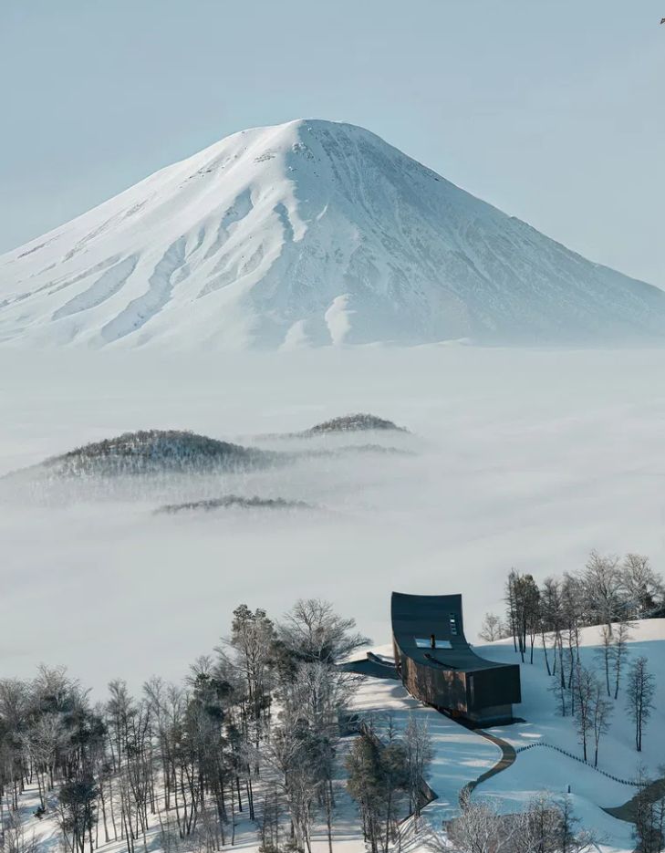 Розташований на схилах гірського курорту Rusutsu з панорамою на вулкан Йотей, проєкт ніби виростає з землі. Один об’єм занурений у схил, інший “плаває” над ним, створюючи гру маси та легкості. Нижній рівень містить зони відновлення — СПА, сауну, зал для медитації, тоді як верхній рівень відкриває простір для зустрічей і життя: вітальню, кухню, внутрішній дворик.