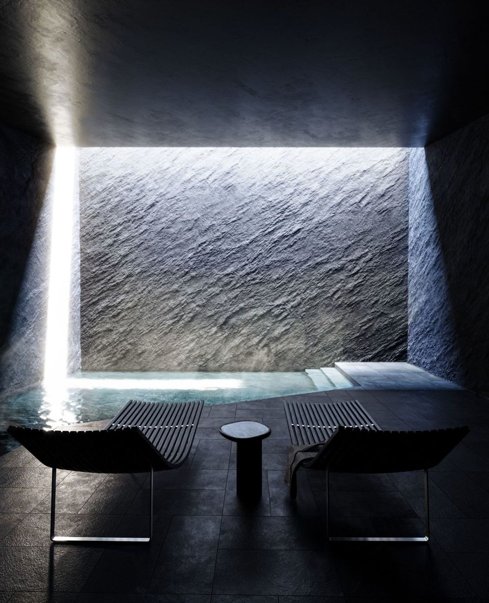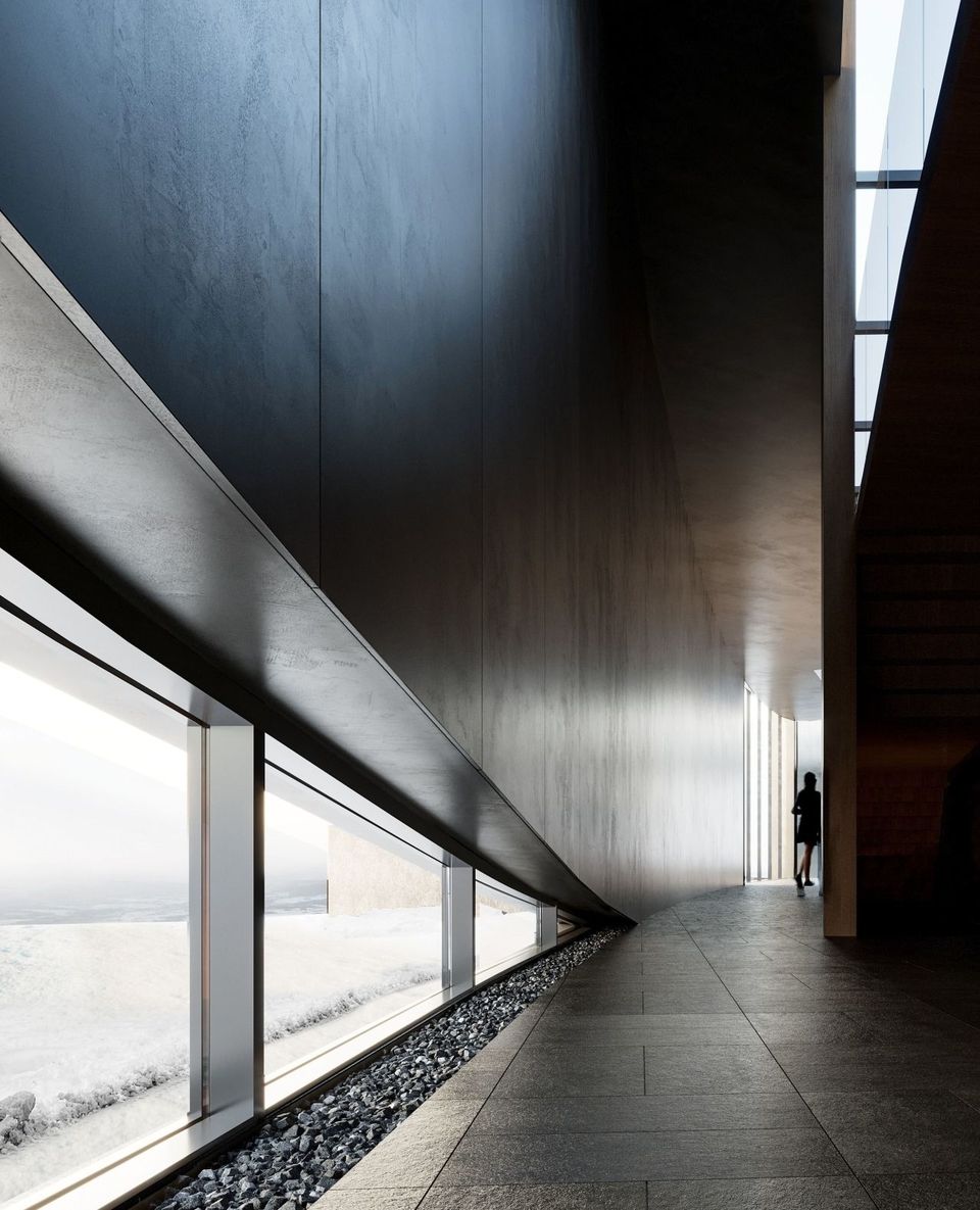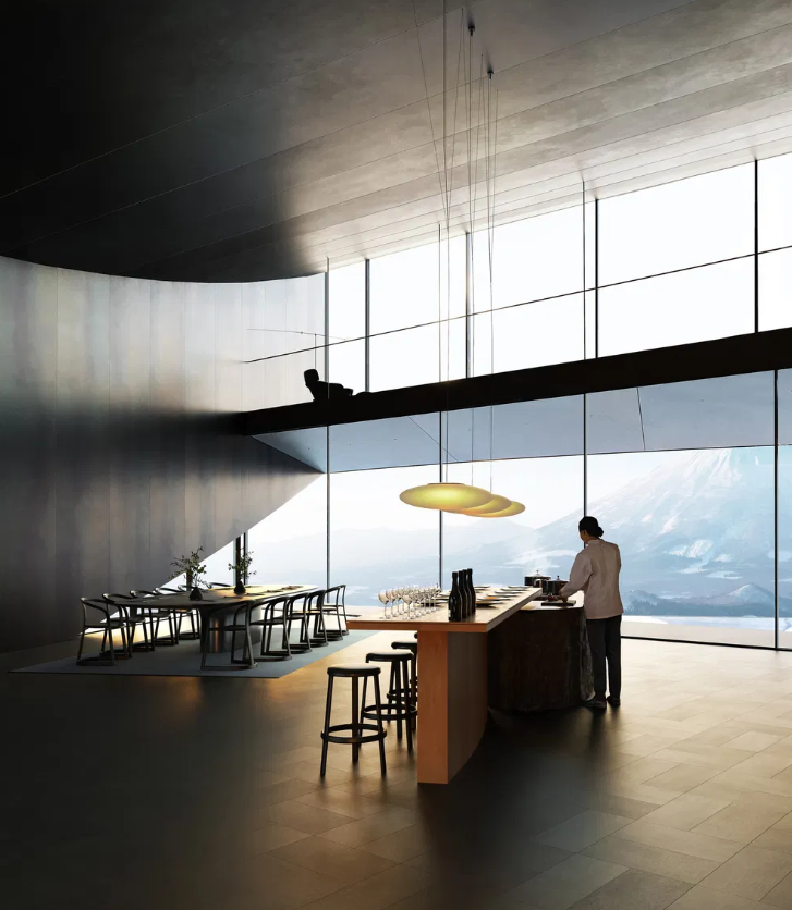 Snøhetta ввели в основу ідею зеніт — найвищої точки, моменту концентрації й піднесення. Вона відчувається у внутрішньому дворику, що стає осердям простору, місцем зустрічей і тиші. Уся архітектура працює з вертикаллю: підйомами, опусканнями, світловими прорізами, що формують ритм життя у горах.