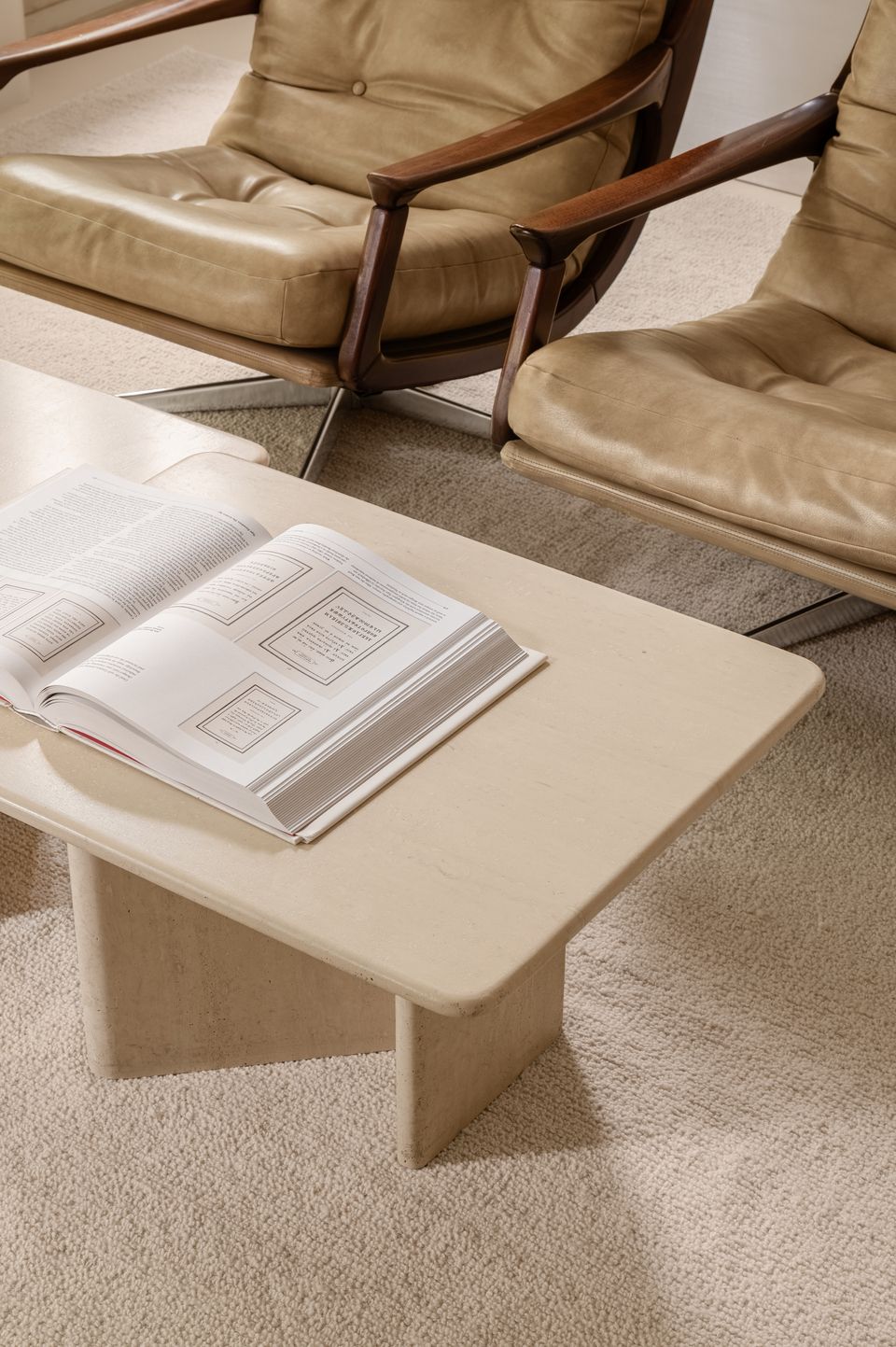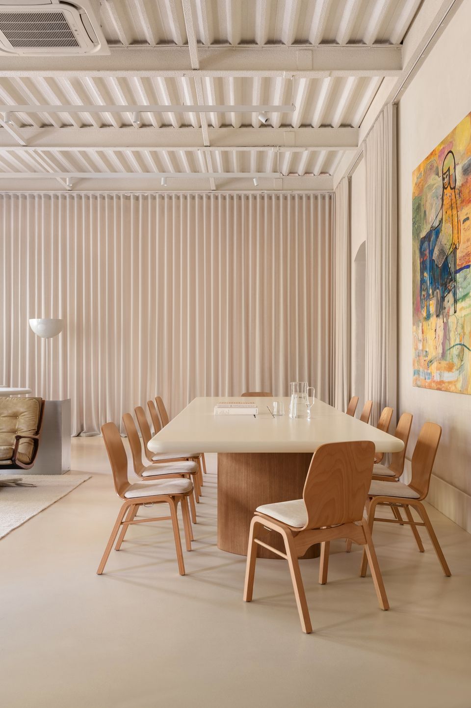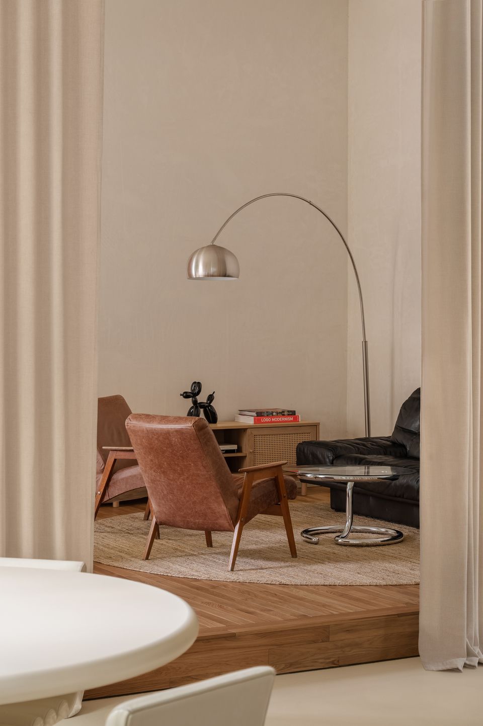 У просторі розміщені кілька меблевих осередків, сформованих із реставрованого вінтажу — від шкіряної софи Eugen Schmidt до легких стільців Frag та складних стільців Chairworks.