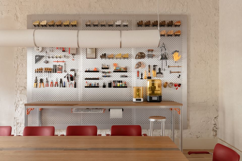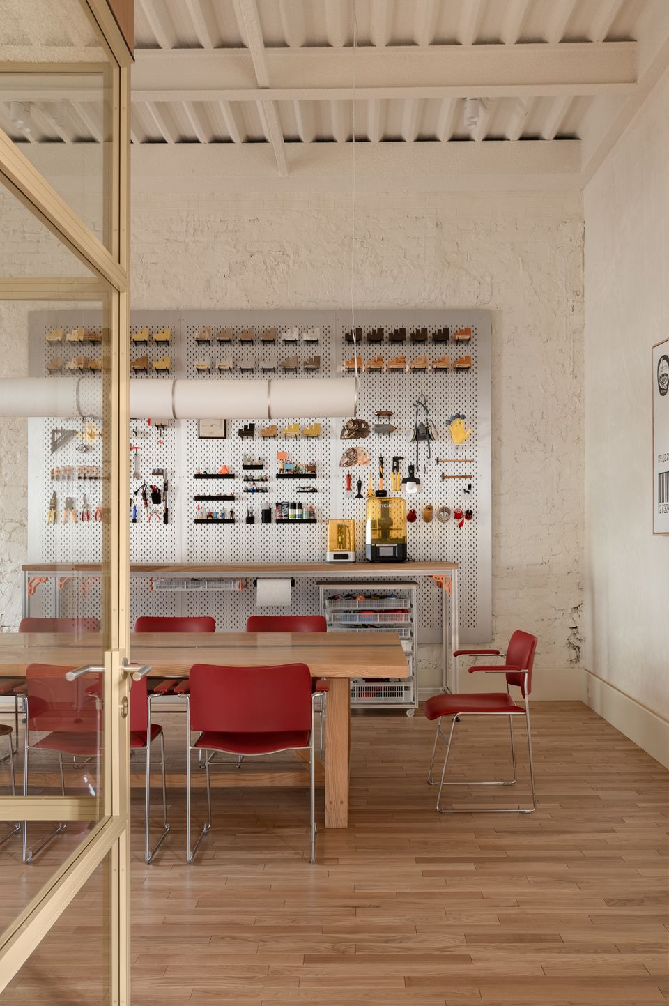 Перфоровані алюмінієві панелі працюють як величезний сортер. Тут зберігаються інструменти, матеріали та колекція нагород агенції — нагадування про цінність процесу.