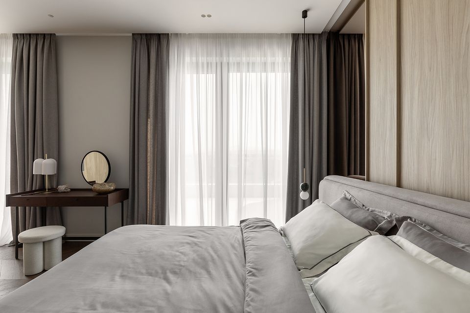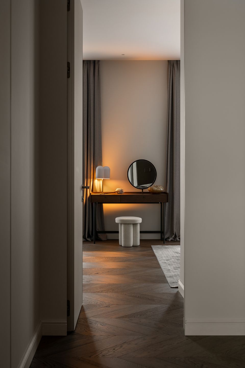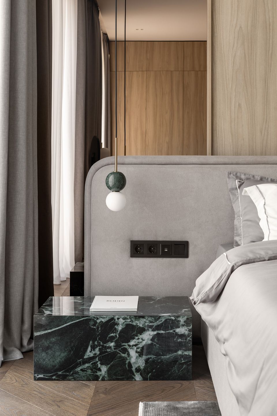 Майстер-спальня продовжує загальну логіку інтер’єру: мінімум зайвого, максимум сенсу. Світле дерево в настінних панелях поєднується з дзеркалом, яке візуально поглиблює простір. Тепле світло локальних світильників і камінь в акценті приліжкової тумби формують відчуття зібраності та комфорту.
