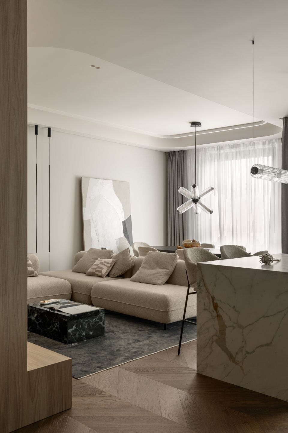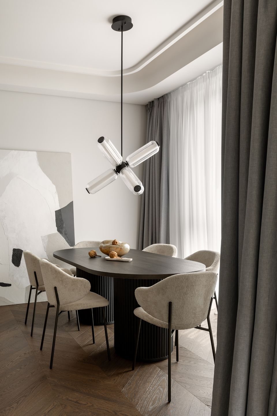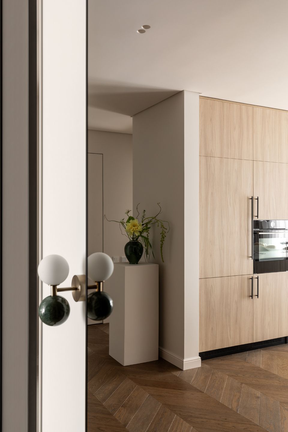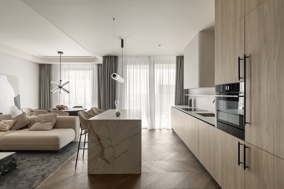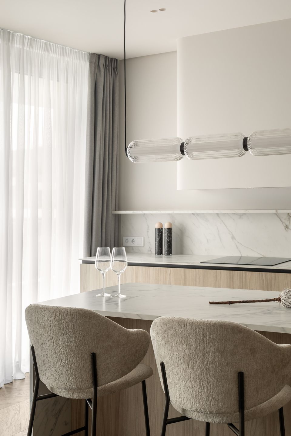 Огляд квартири площею 107 м² починається з кухні — простору, де світло стає повноцінним елементом інтер’єру. Сонце заходить сюди ближче до вечора й м’яко розтікається по фактурах світлого дерева, мармуру з делікатним малюнком та текстурі букле на стільцях.
