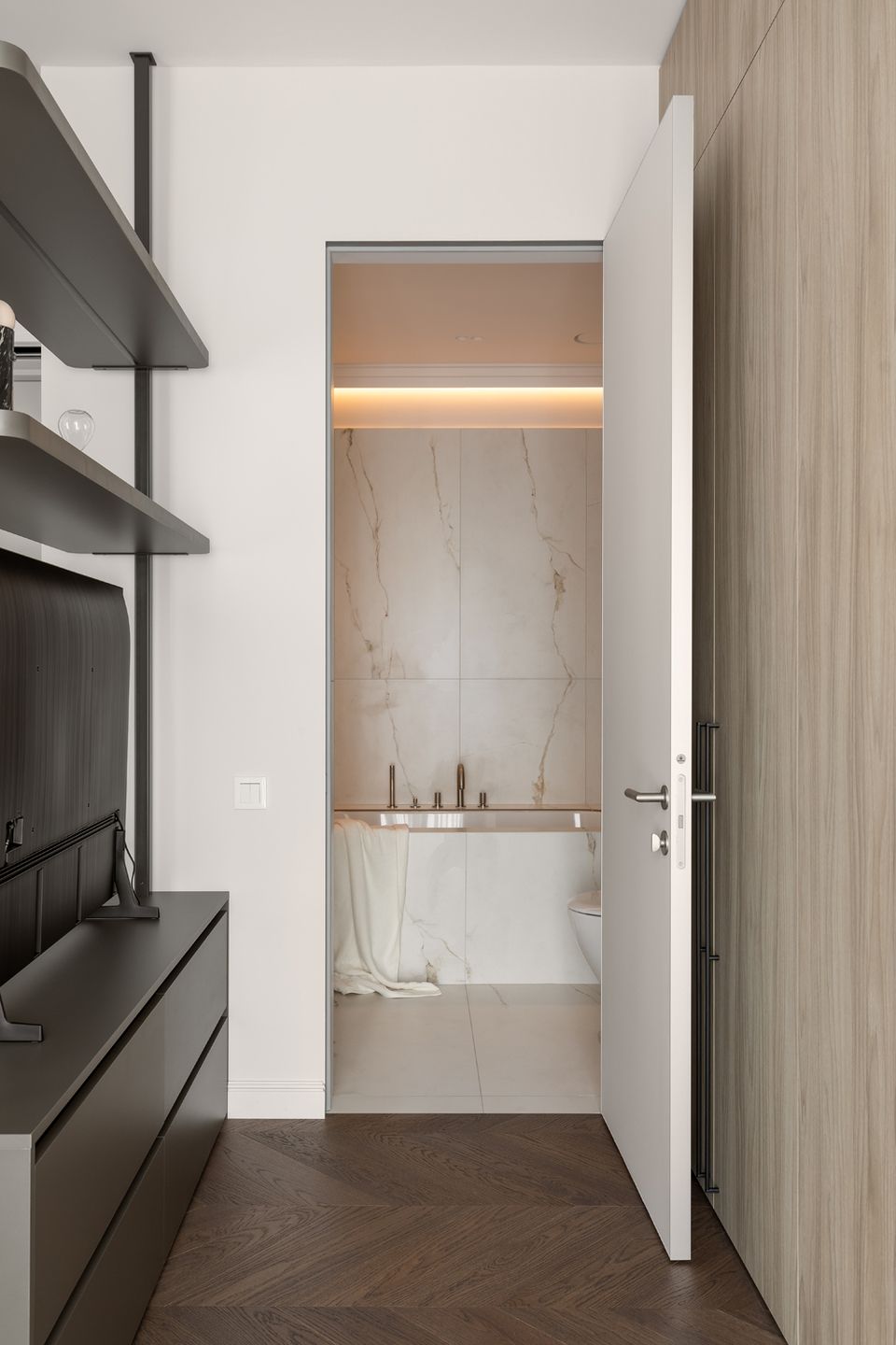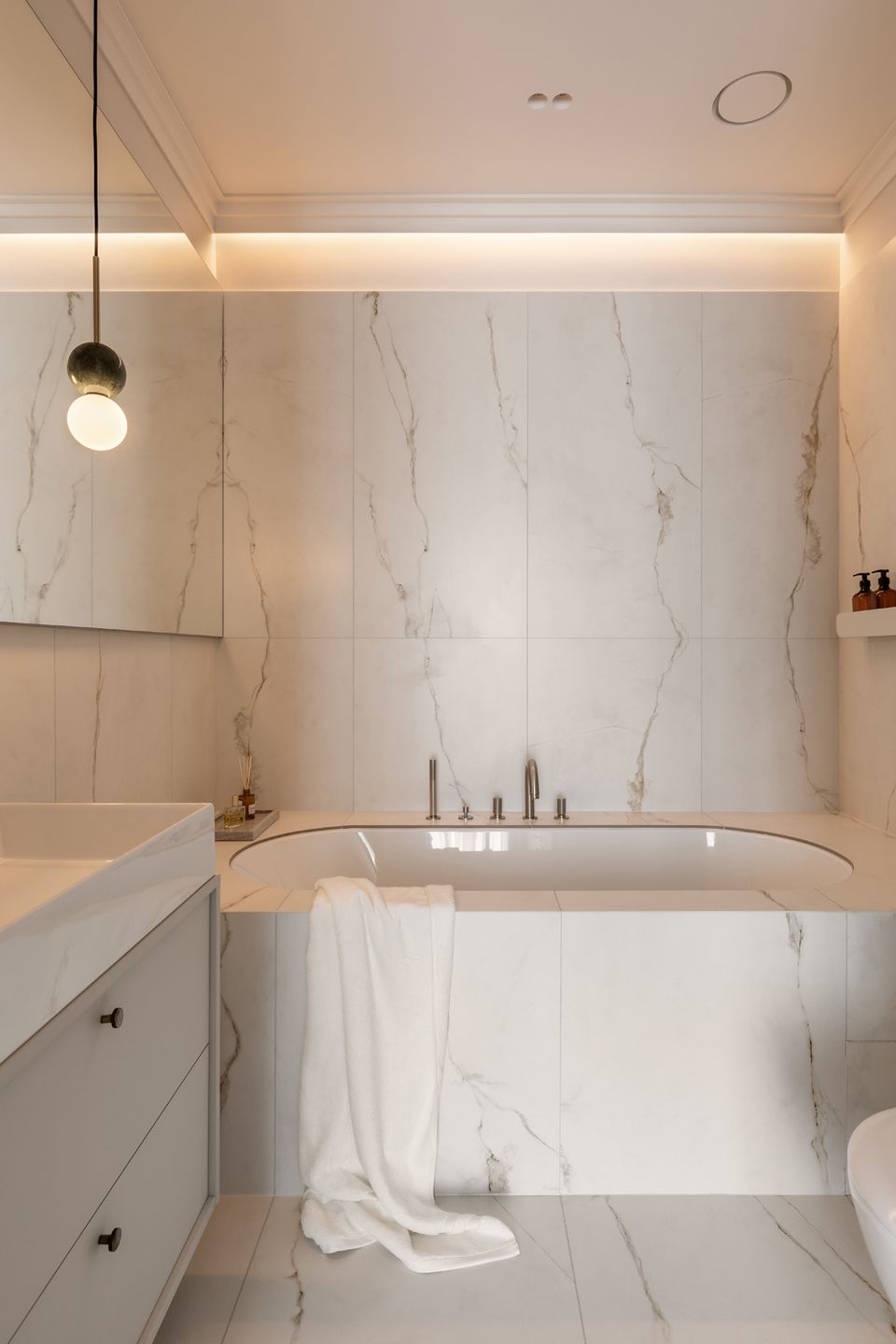 Майстер-санвузол задумувався як простір уповільнення — і саме цей сценарій став визначальним. Центральний елемент — ванна, повністю інтегрована в об’єм і облицьована керамогранітом. Такий підхід створює відчуття монолітності й цілісності, а широкі борти додають і естетики, і практичності.