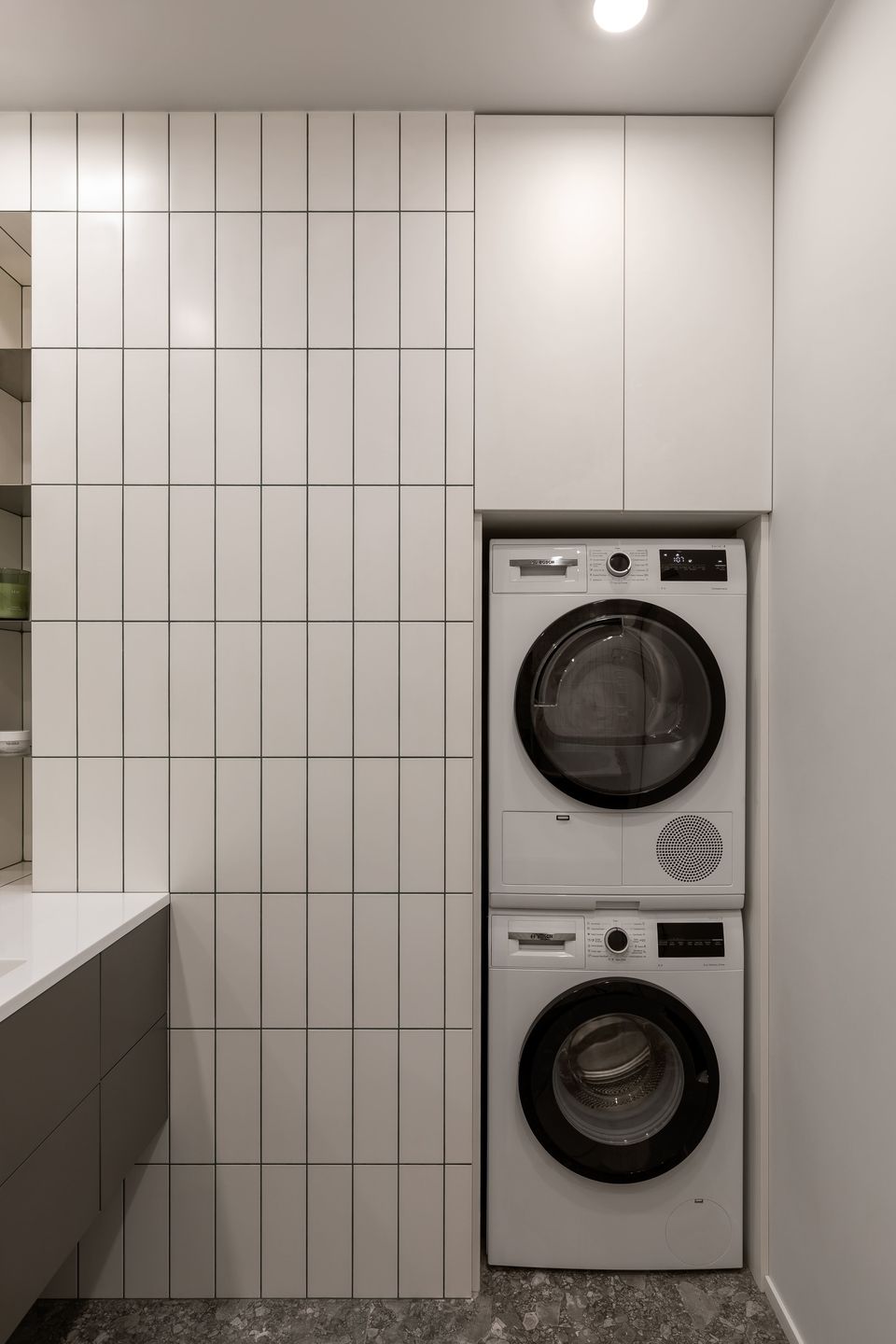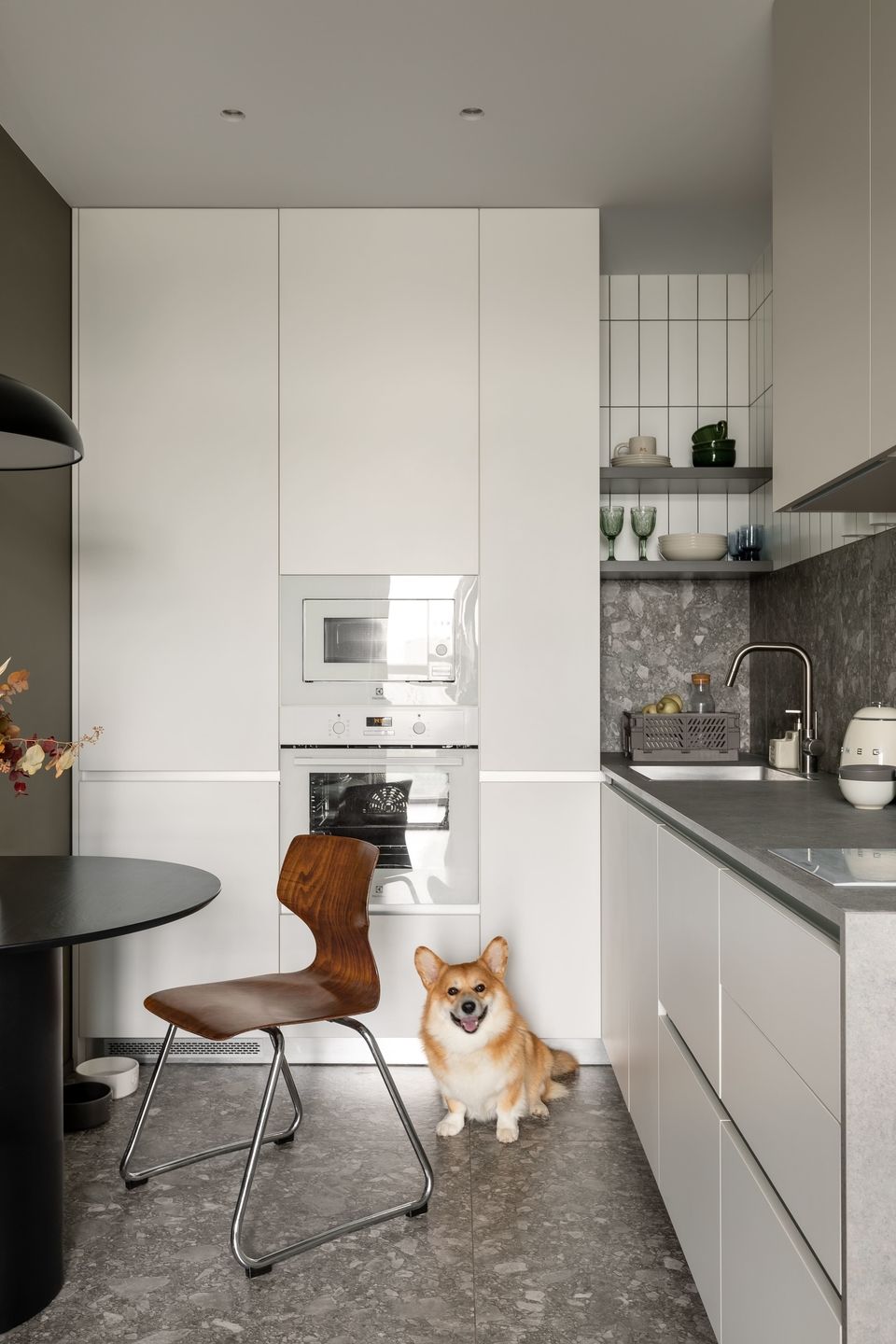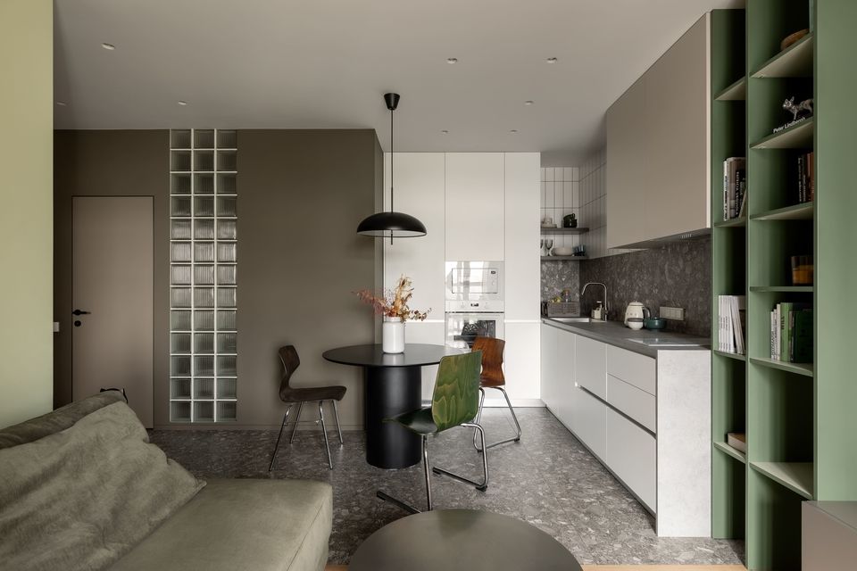 Кухня інтегрована в загальну зону і працює як центр тяжіння. Світлі фасади поєднуються з кам’яною текстурою фартуха та темними світловими акцентами, формуючи графічний баланс. Скляні блоки пропускають світло вглиб квартири — це не просто декоративний прийом, а спосіб зберегти природну глибину простору без втрати приватності.