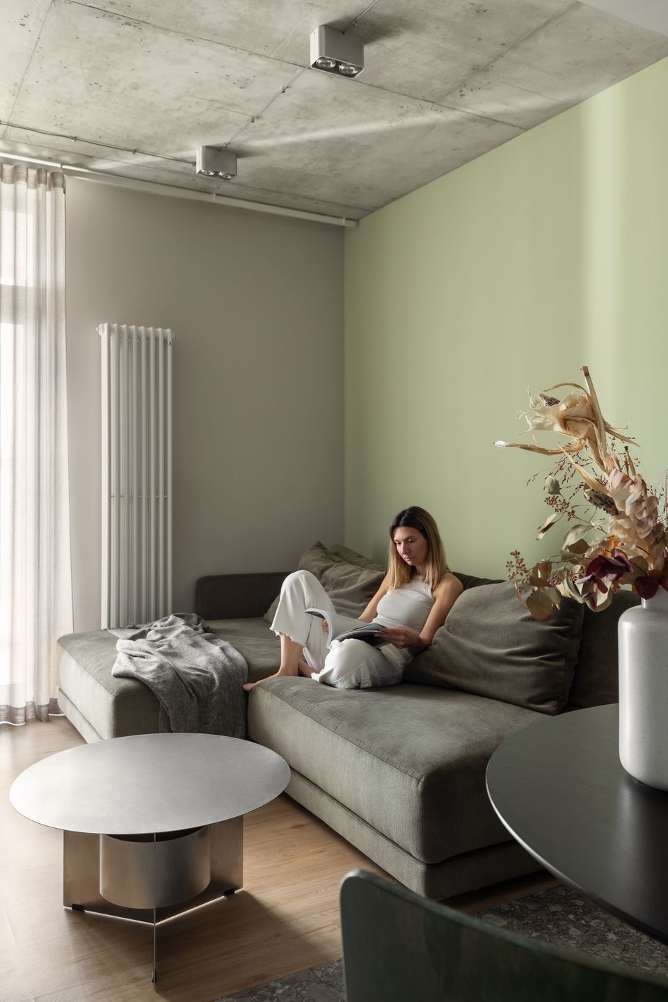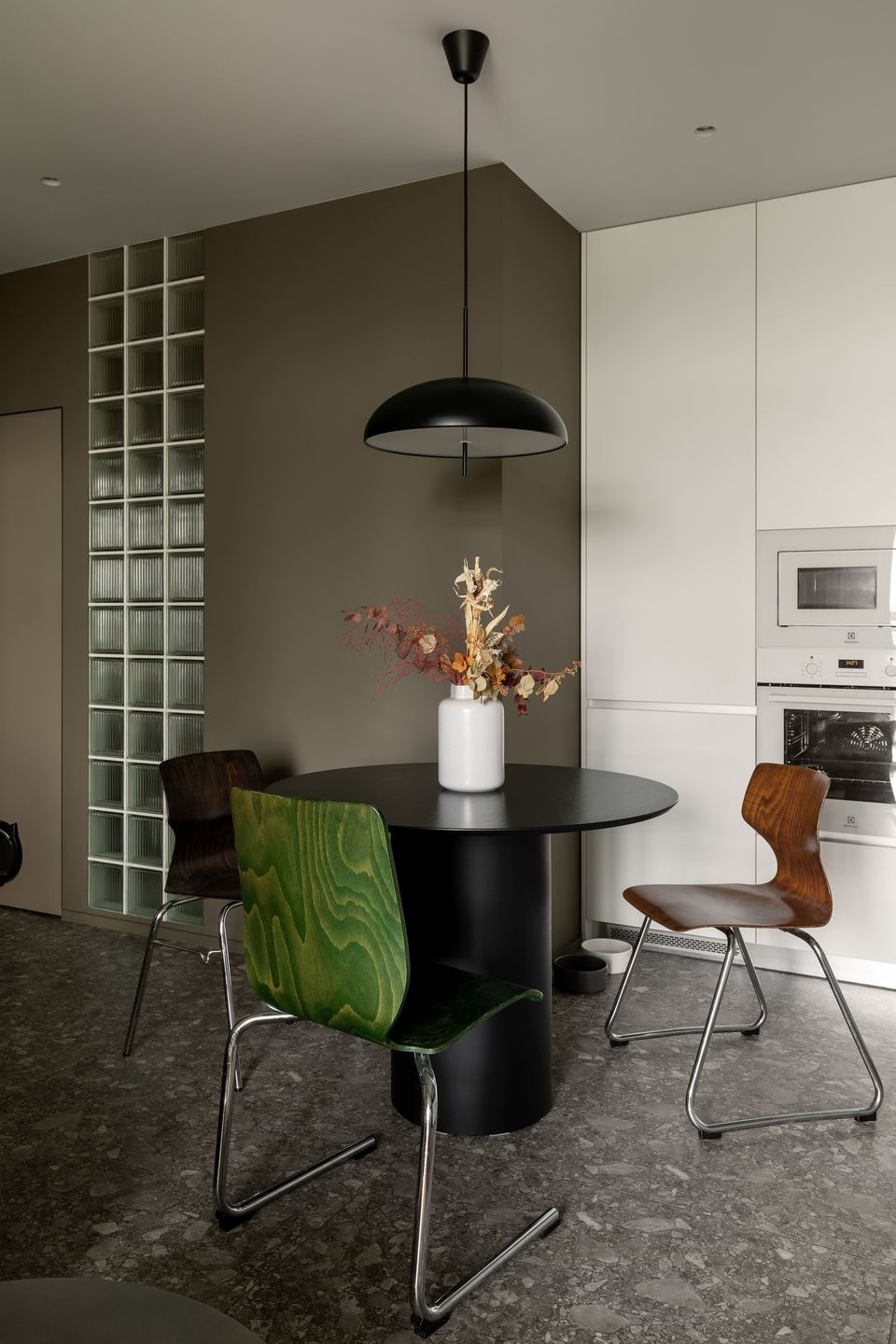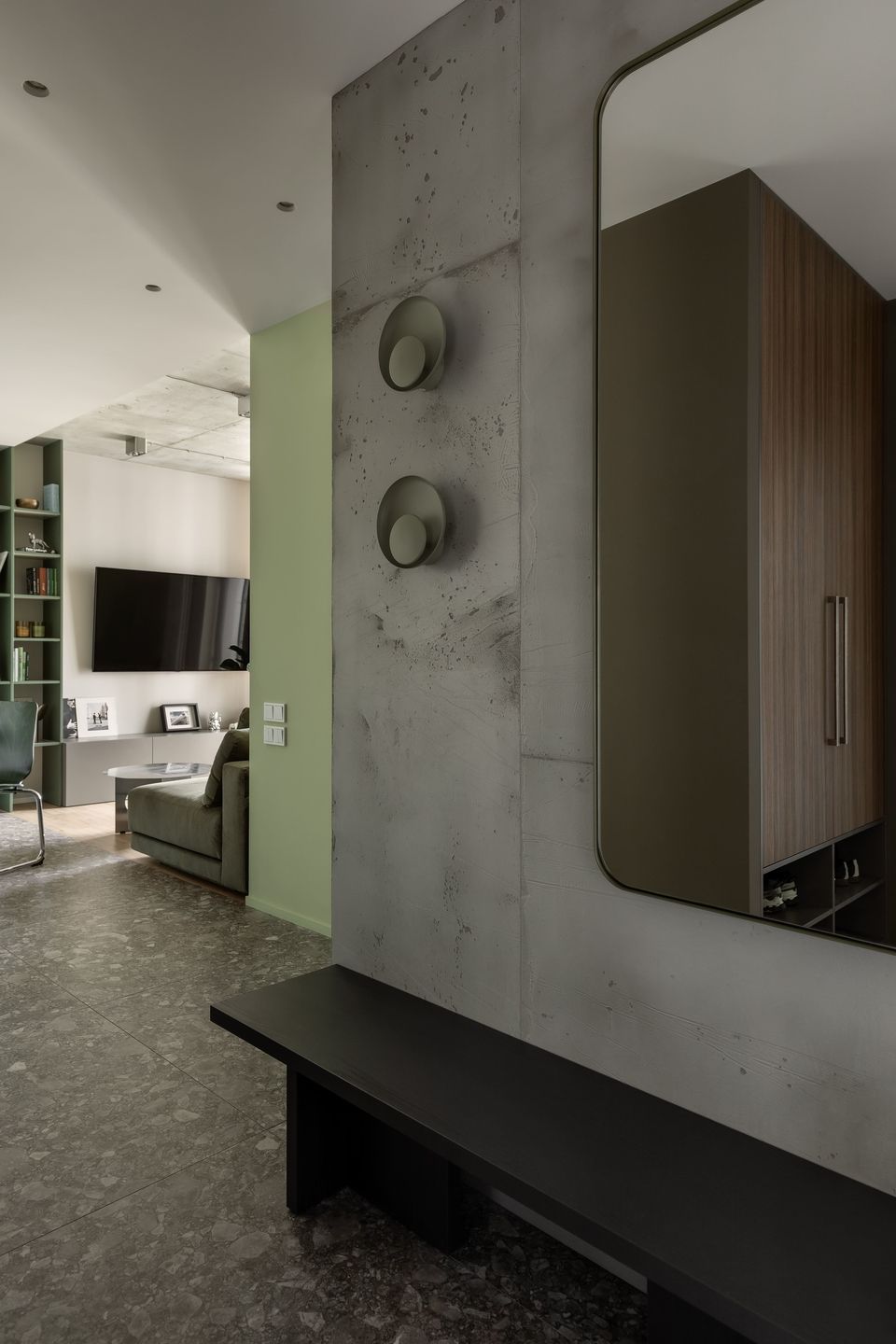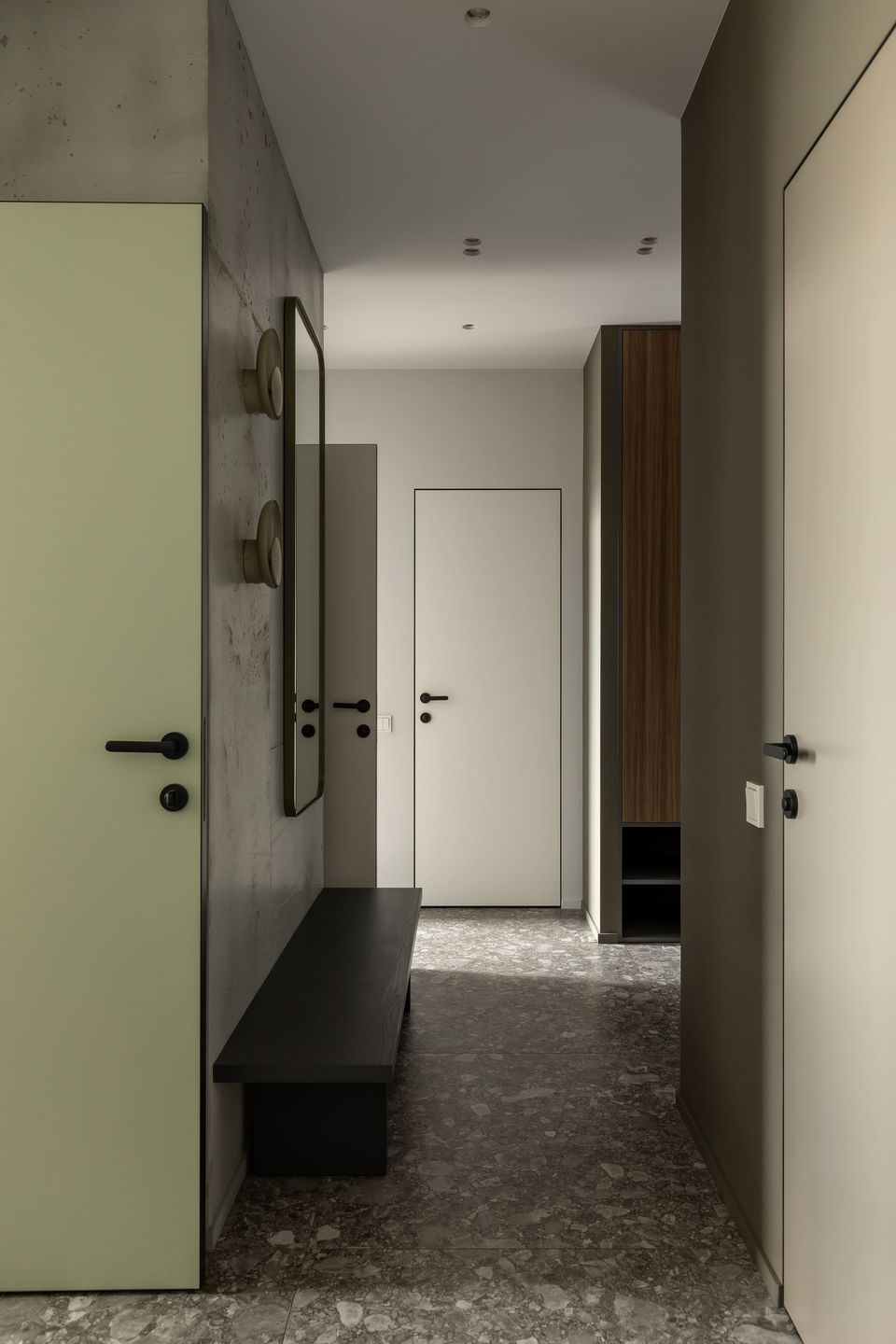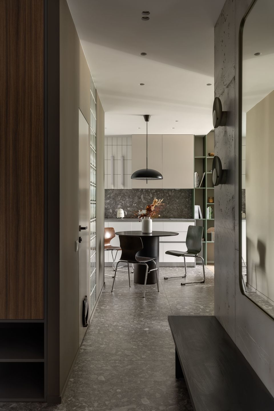 Матеріальна палітра побудована на контрасті полірованих і мінеральних поверхонь із теплим деревом та приглушеною зеленою гамою. Це діалог між містом і природою, між раціональністю та відчуттям дому. Вбудовані системи зберігання формують чисту архітектуру — без візуального шуму, без перевантаження.