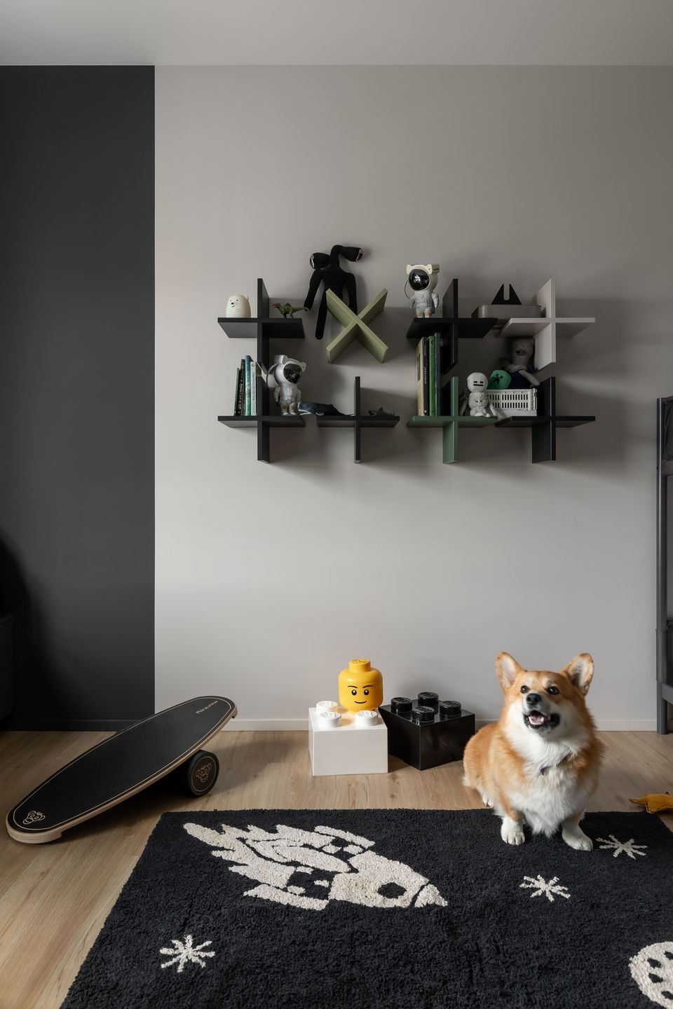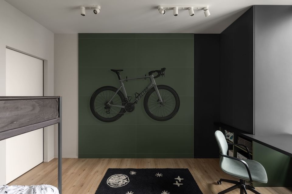 Дитяча спроєктована як простір трансформації. Вона не “дитяча” у звичному розумінні — це середовище, що може змінюватися разом із власником. Двоярусне ліжко стає маленькою архітектурою всередині кімнати, графічні полиці додають персональності, а робоча зона біля вікна з видом на місто формує зв’язок із зовнішнім світом. Простір балансує між грою та дорослішанням.