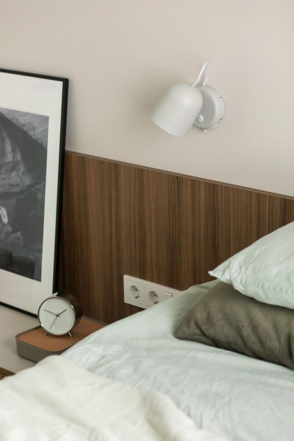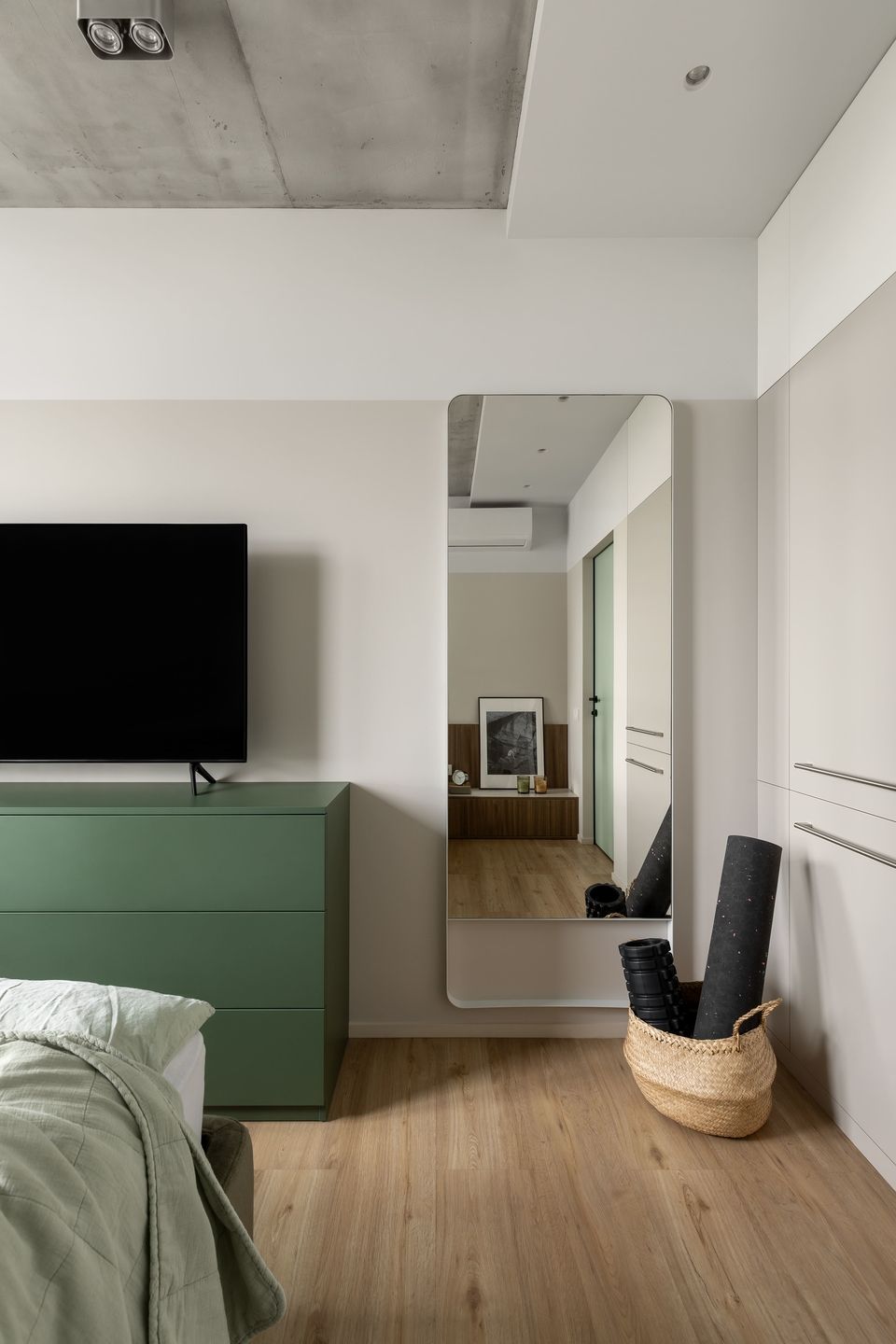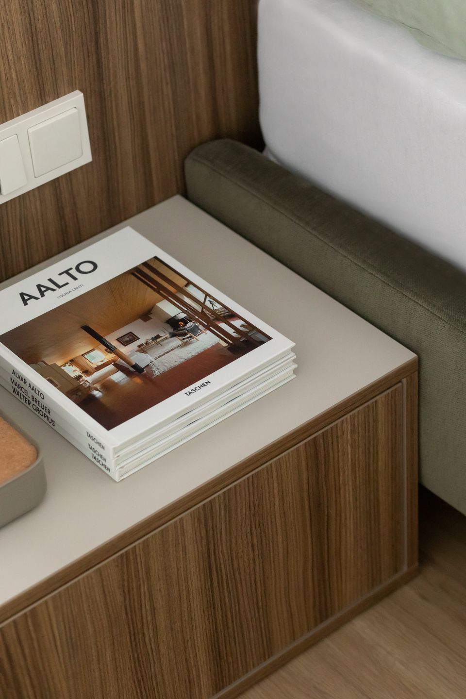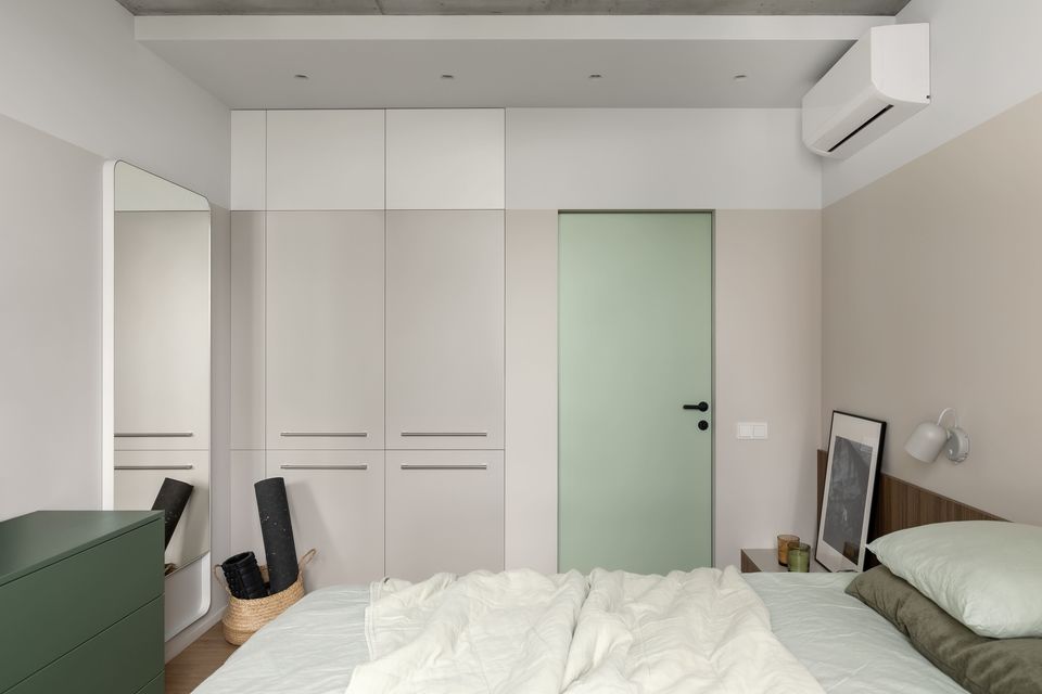 Спальня — це простір відновлення, де ритм квартири ніби сповільнюється. Тепле дерево, текстиль і глибокий зелений створюють камерну атмосферу без надлишкових акцентів. Тут домінує не декор, а відчуття.