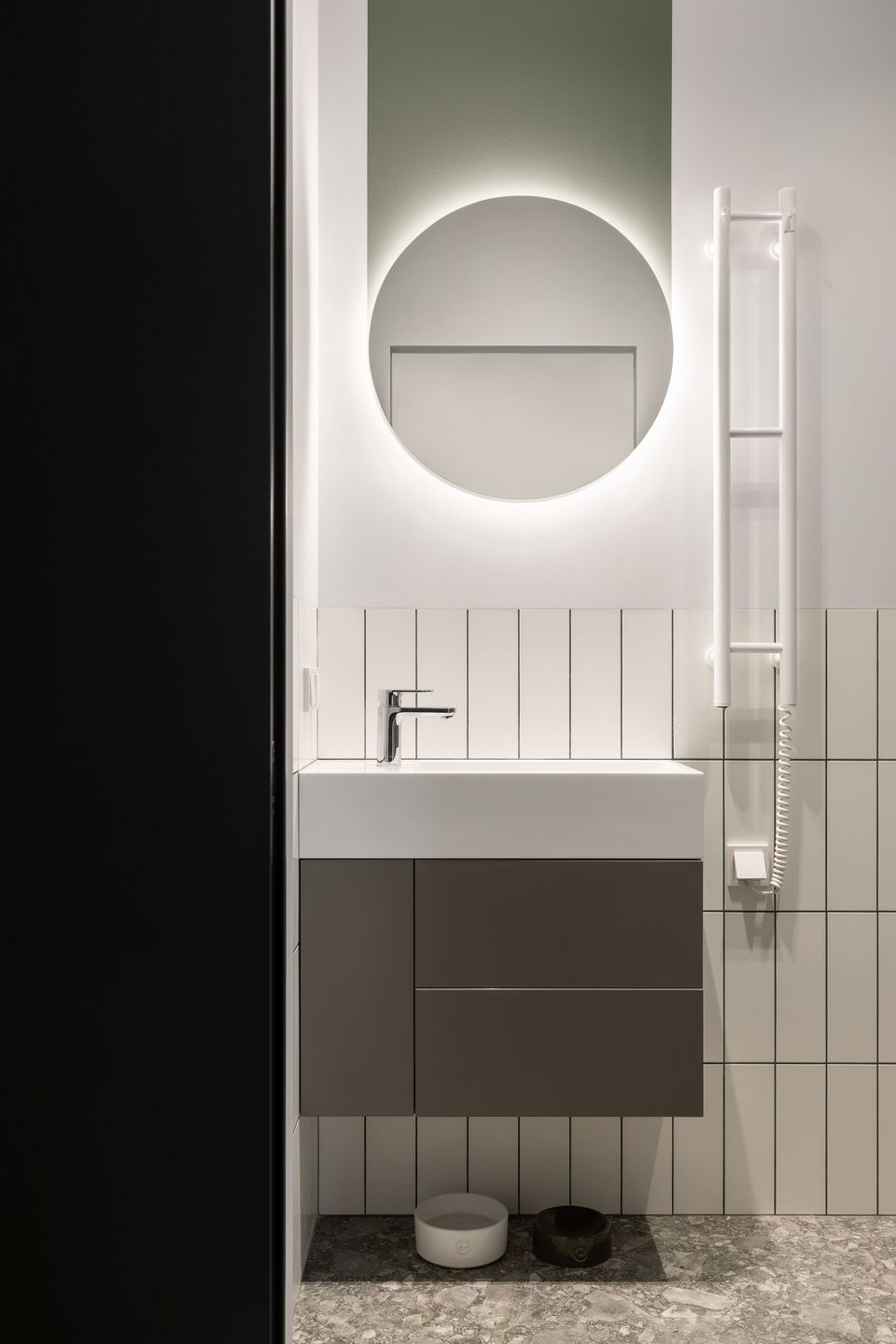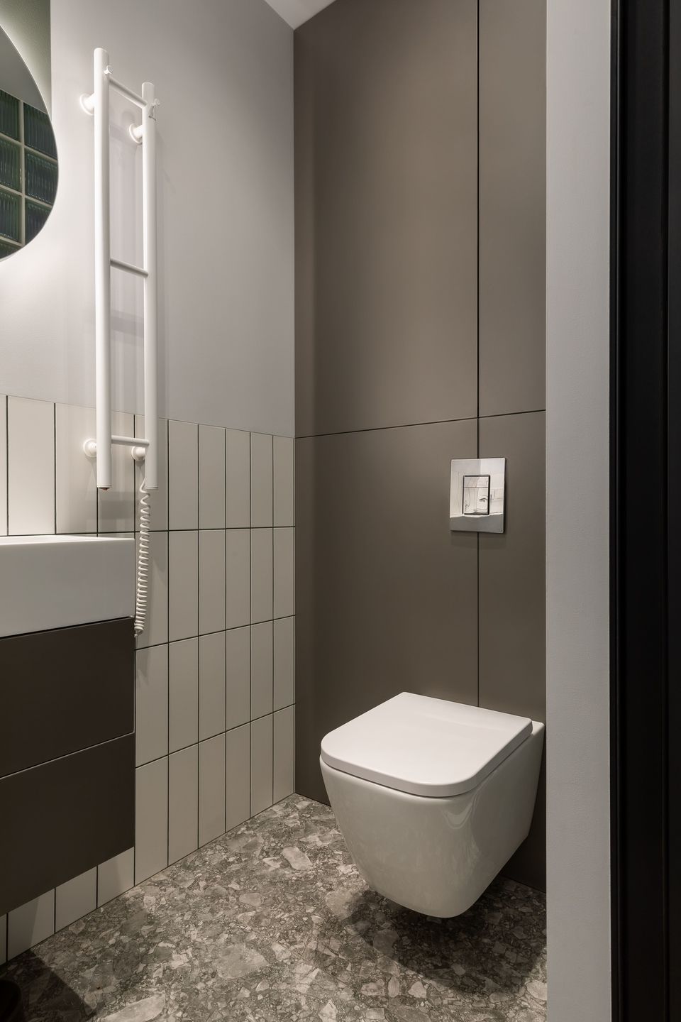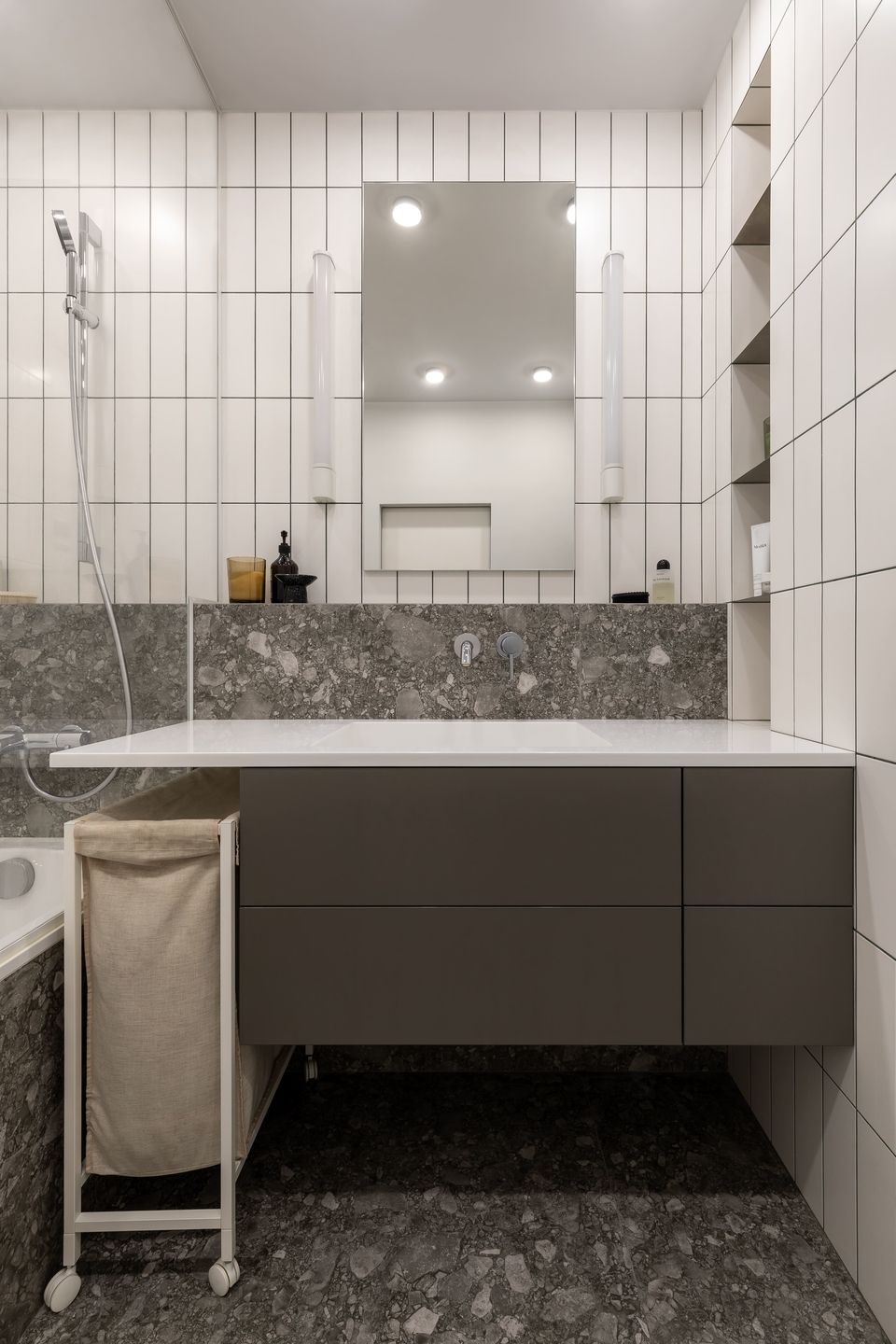 Санвузли витримані у спокійній, графічній естетиці. Керамічна плитка з чіткою сіткою зелених швів, кам’яна текстура підлоги та лаконічні меблеві блоки продовжують єдину матеріальну логіку квартири. Контраст світлих площин і глибших відтінків додає структурності, а дзеркала й світло працюють на розширення простору. Гостьовий WC компактний, але функціонально насичений; основна ванна — більш пластична та м’яка, орієнтована на комфорт щоденного використання.