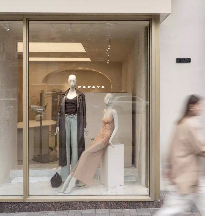 Простір Papaya запамʼятовується мʼяким світлом та геометрією. В ньому немає яскравих акцентів. Власники прагнули, аби простір викликав відчуття оновлення, коли відвідувачі думають про бренд. Шоурум, з яким ми працювали, розташований в історичній будівлі, тож основа концепції – поєднання минулого із сучасністю. Стіни з ракушняка та анодовані алюмінієві вітрини стали акцентними, а не прихованими частинами інтерʼєру.