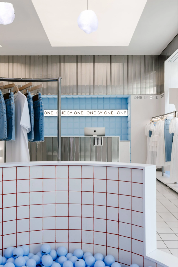 У шоурумі One by One ми зробили сучасний грайливий дизайн, основою якого є мінімалізм, а особливим доповненням – інтерактивні елементи. Засновники бренду хотіли створити простір, у якому під час вибору одягу, гості зможуть відволіктися від тривожних реалій. Так, у центрі простору ми розмістили басейн, заповнений кульками, у який можна пірнути у буквальному сенсі, або принаймні влаштувати розважальну фотосесію.