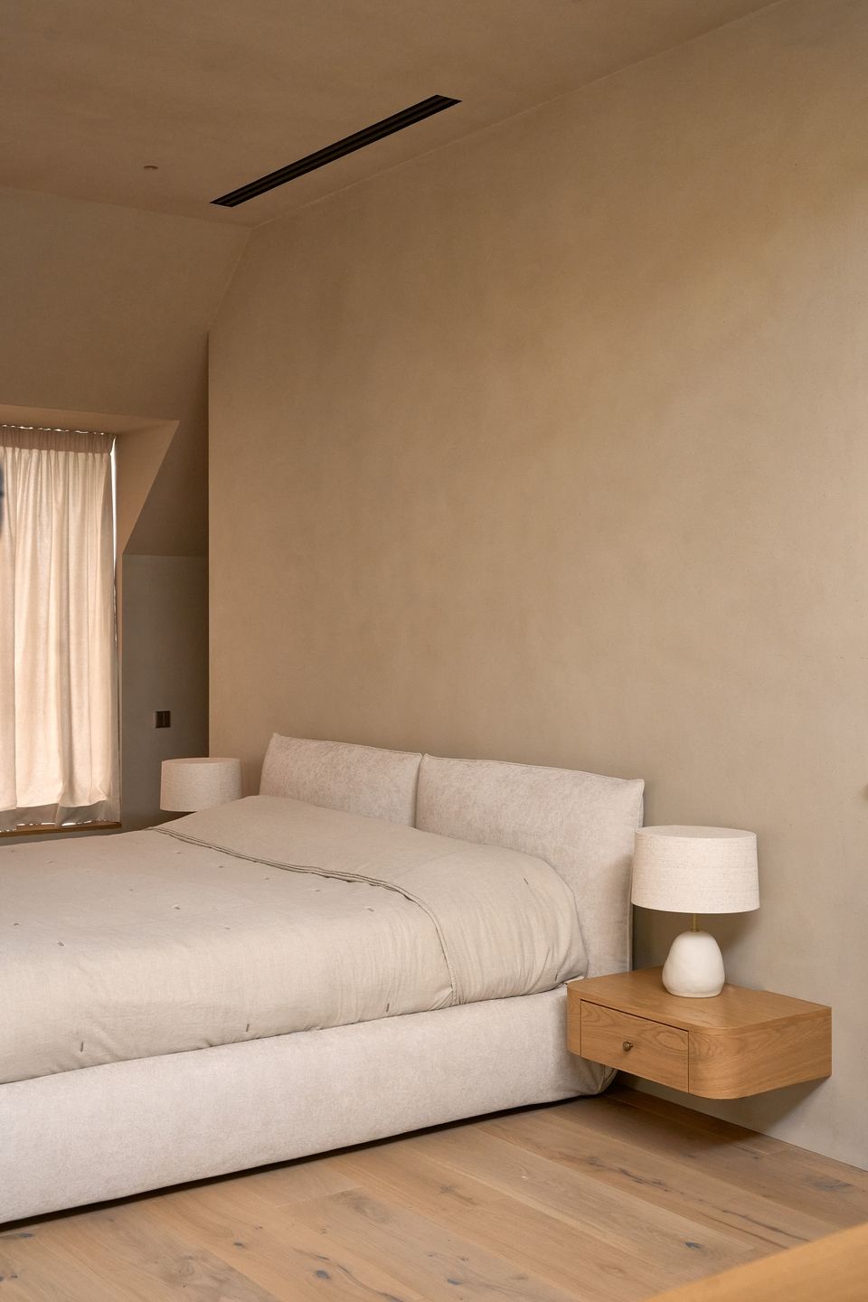 У майстер-спальні природне світло відіграє ключову роль. Окрім вікон із видом на ділянку, передбачено мансардні прорізи, які забезпечують якісне освітлення зони для макіяжу. Ті самі матеріали, що й у всьому будинку, тут звучать особливо м’яко — теплі, тактильні, вони формують атмосферу приватності та спокою.