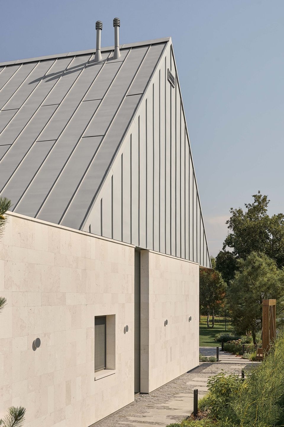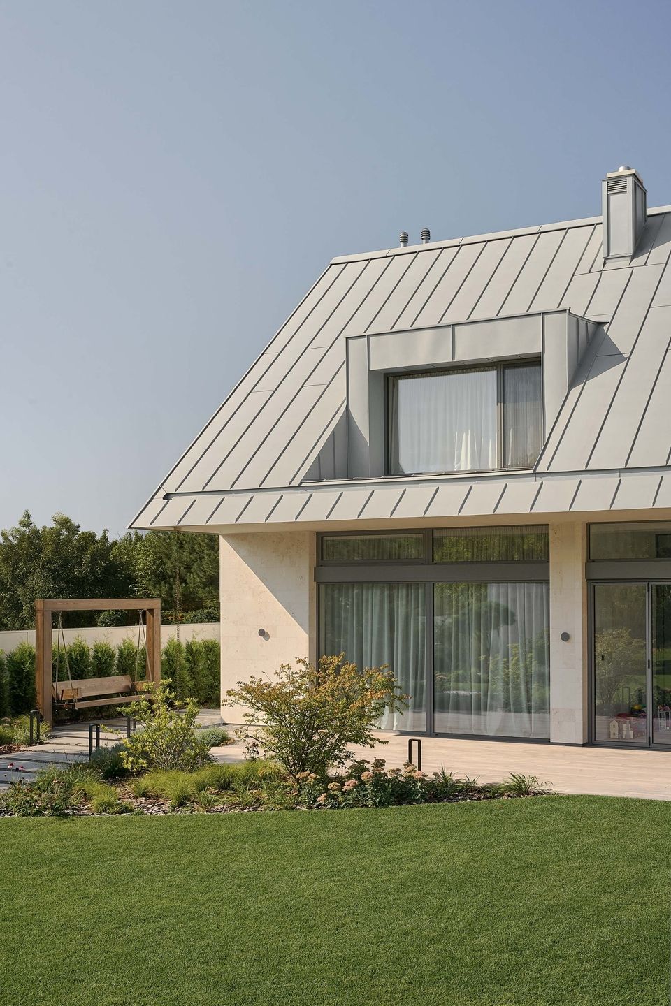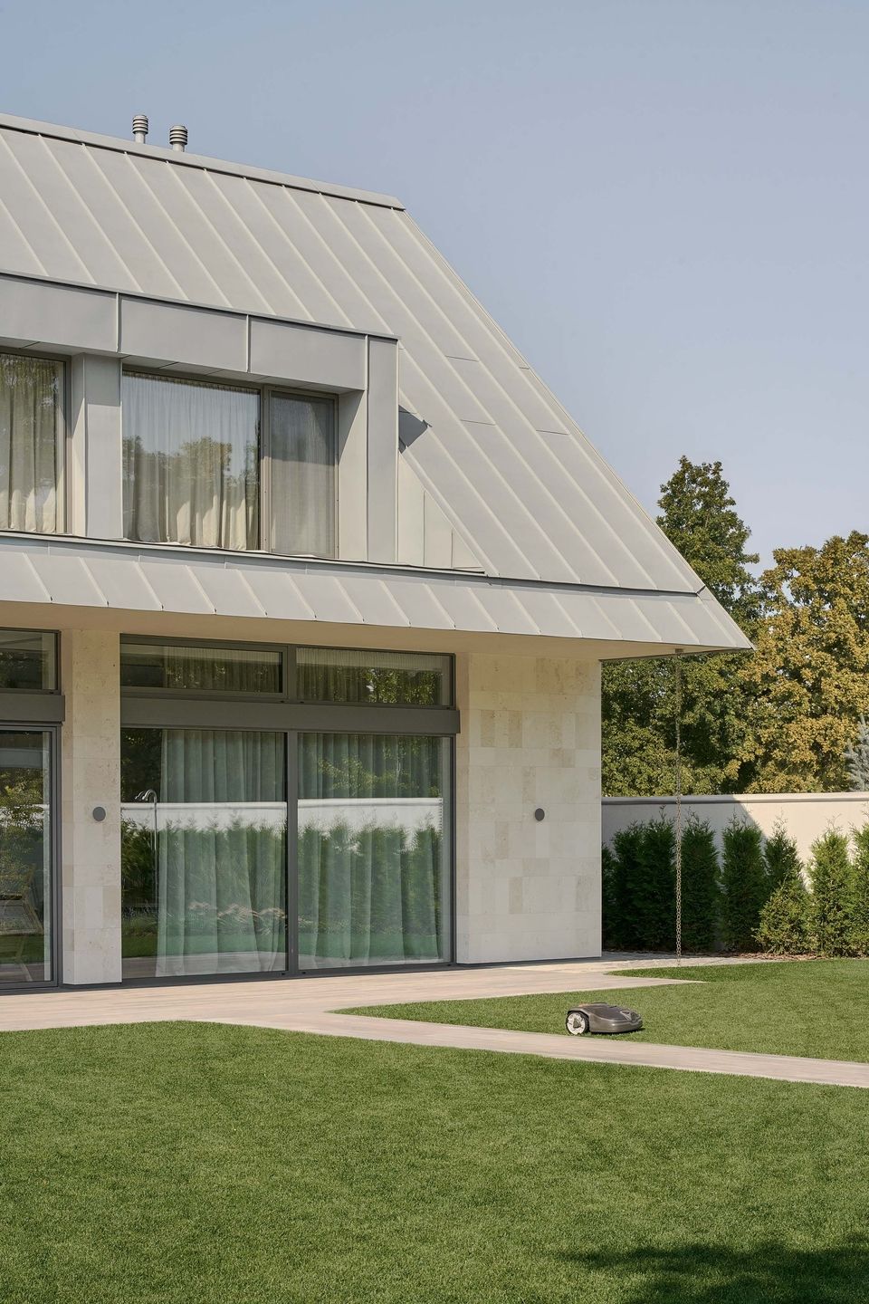У холі другого поверху дахове вікно не лише наповнює простір світлом, а й делікатно кадрує небо. Виходячи з кімнати, мешканці бачать його ніби в рамці. Постійно змінюючись, небо стає безкоштовним, але безцінним артоб’єктом інтер’єру — живим елементом, що запрошує зупинитися й подивитися вгору.