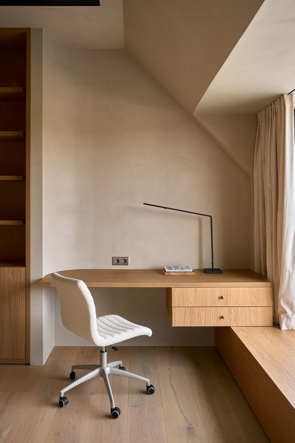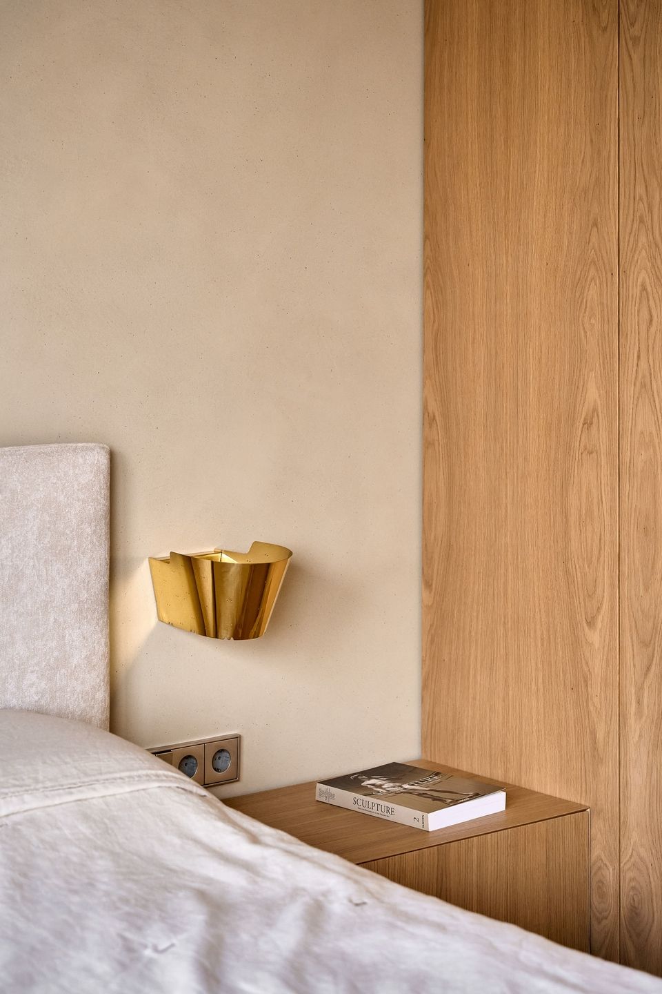 Основою концепції стала максимальна цілісність. У всьому будинку площею 300 м² — на всіх поверхах і в усіх кімнатах — використано один відтінок стін із декоративної штукатурки. Лише один тип плитки та один тип паркету, а також єдина порода дерева для меблів. Така обмежена палітра створює сильне відчуття єдності: простір читається як цілісний об’єм, хоча кожна кімната зберігає власний характер.