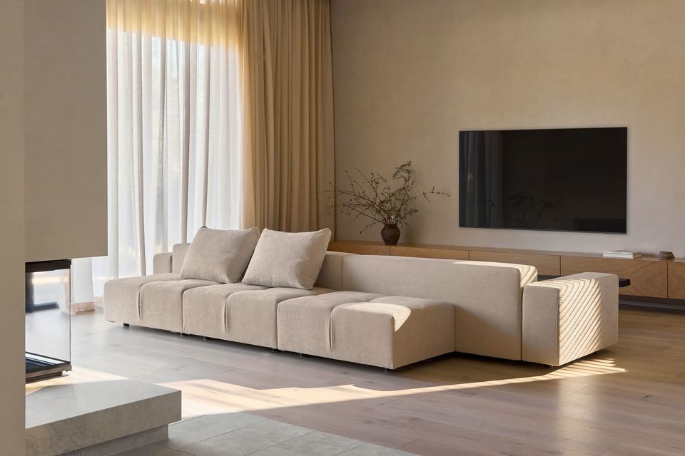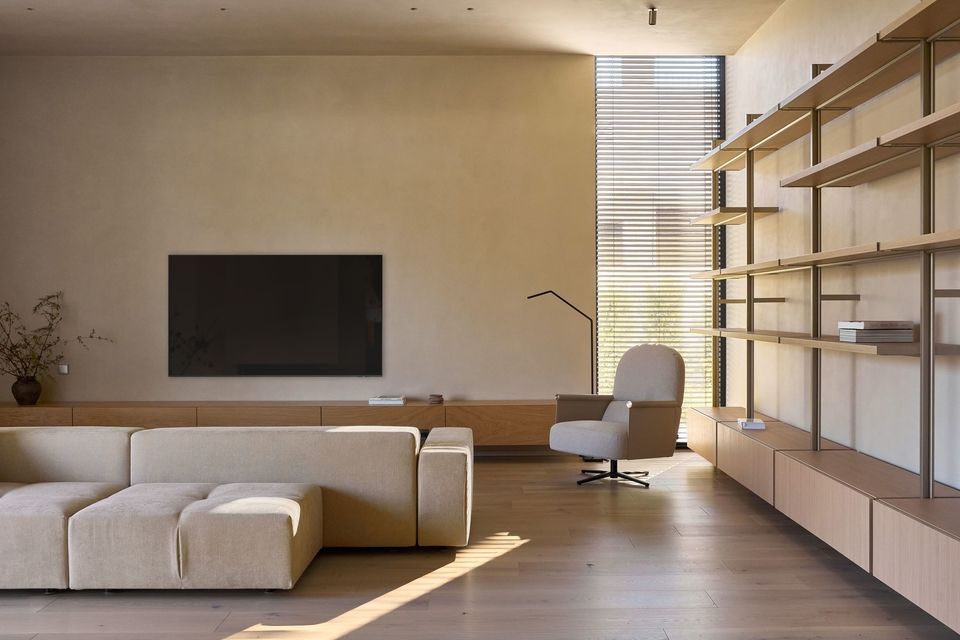Вітальня організована навколо двох протилежних акцентів — телевізора та справжнього великого каміна. У відповідь на цю вісь архітектори спроєктували диван із посадками, орієнтованими в обидва боки, що дозволяє простору залишатися гнучким і відкритим до різних сценаріїв використання.