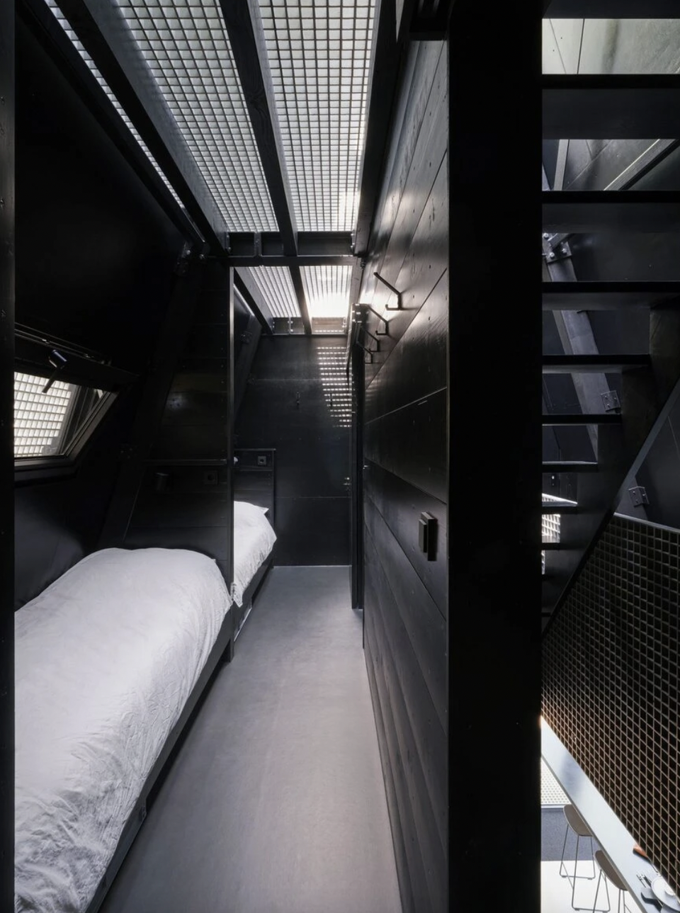 Спальня на верхньому рівні розташована під скляним дахом, який пропускає природне світло вглиб будинку — зокрема до додаткових спальних зон на першому поверсі. Архітектори продумали систему природної циркуляції повітря: стратегічно розташовані отвори у фасаді та решітчасті ділянки підлоги забезпечують вертикальний рух повітряних потоків.