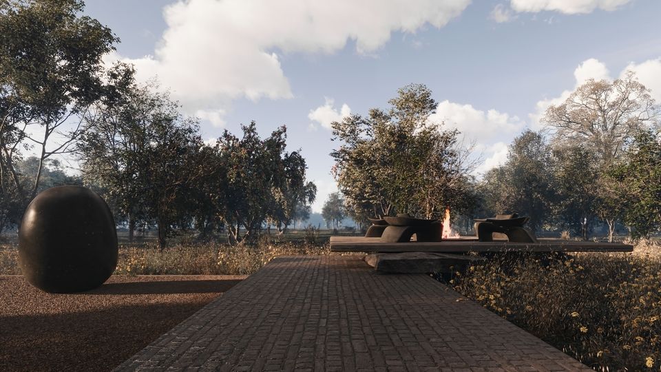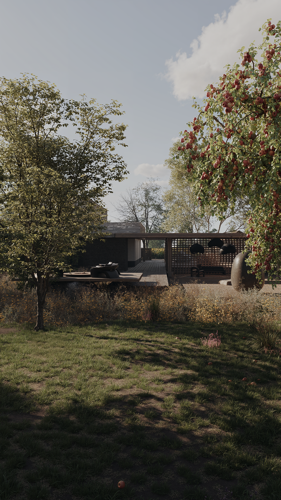 Двір SVITLYTSIA став продовженням ідеї єдності з природою. Тут з’явився медитативний кам’яний сад, критa терасa та вогнище для довгих літніх вечорів. Декоративна дерев’яна перегородка створює унікальний світловий малюнок, що змінюється протягом дня.
